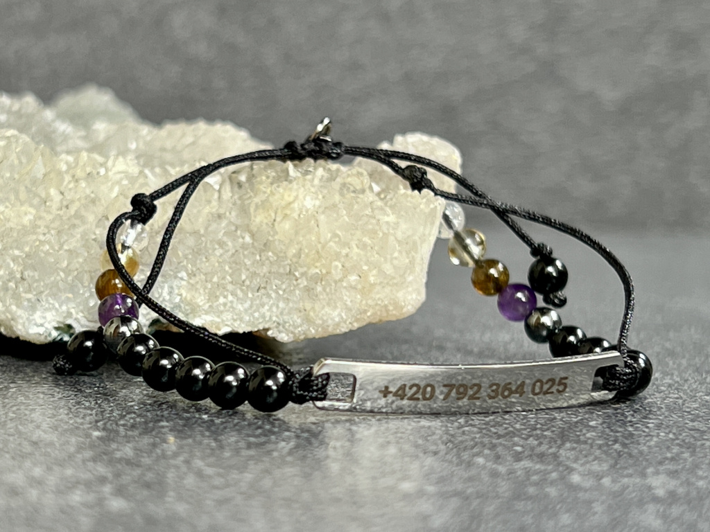 Praktický náramek s telefonním číslem ocení nejen rodiče malých dětí, ale i senioři, kteří trpí špatnou pamětí. Je sestavený z ochranných kamenů, které vám pomůžou překonat jakoukoliv nestandardní situaci a zmírnit nervozitu.