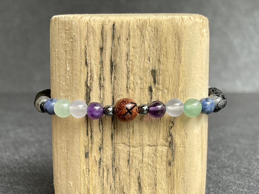 - Dřevěná kulička, tmavě gravírovaná symbolem Střelce – přírodní detail, který propojí náramek s vaším znamením.