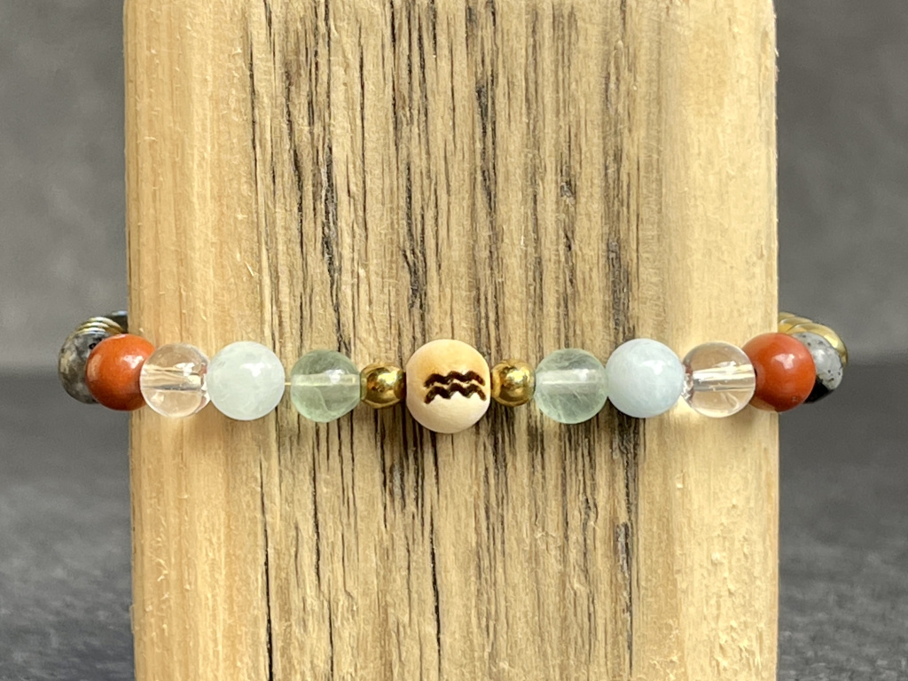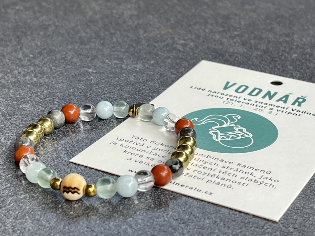 Ručně navlékaný náramek pro všechny tolerantní a vtipné Vodnáře. Sestava kamenů pomáhá zkrotit roztěkanost a přetlak plánů a zároveň posiluje vaše silné stránky – komunikaci, originalitu a inteligenci.