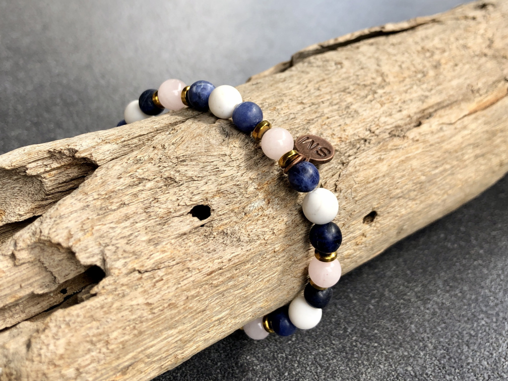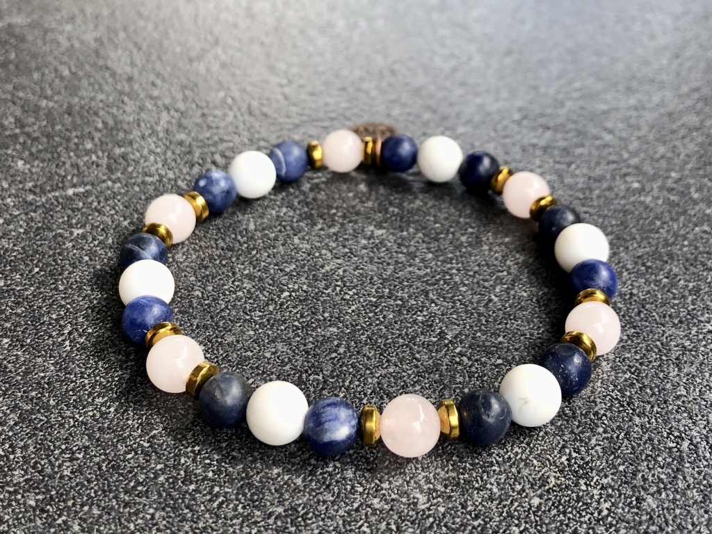 Nádherný náramek sestavený z růženínu, sodalitu a magnezitu uvádí svým vzhledem i výběrem minerálů do harmonie celé tělo tělo i duši.