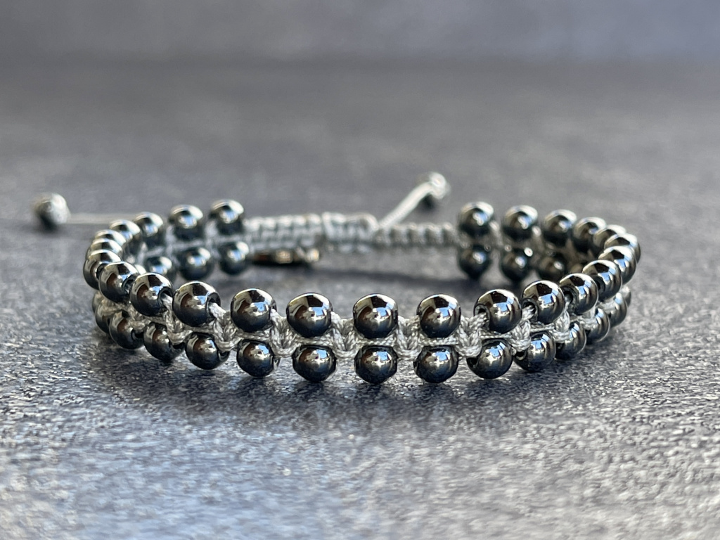 Ručně pletený náramek z hematitem chrání proti negativním vlivům z okolí. Tím uvádí do rovnováhy tělo, mysl i ducha. Zvyšuje sebevědomí, spolehlivost, důvěryhodnost, soustředění, zlepšuje paměť a rozvíjí osobnost.