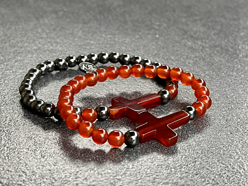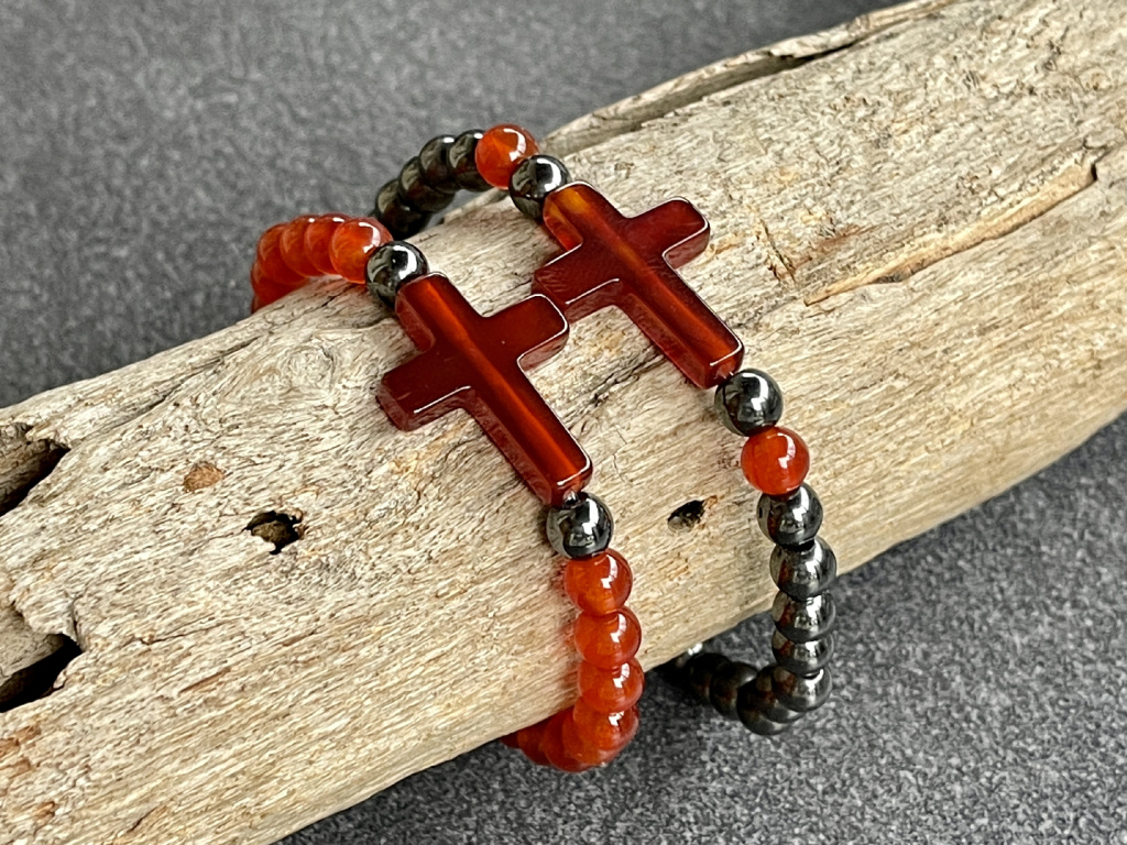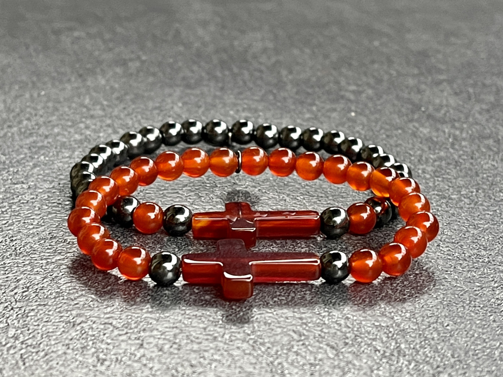 Párové náramky z hematitu a karneolu doplněných o karneolový křížek slouží jako ochranný talisman který zabraňuje negativním energiím vstoupit do aury.