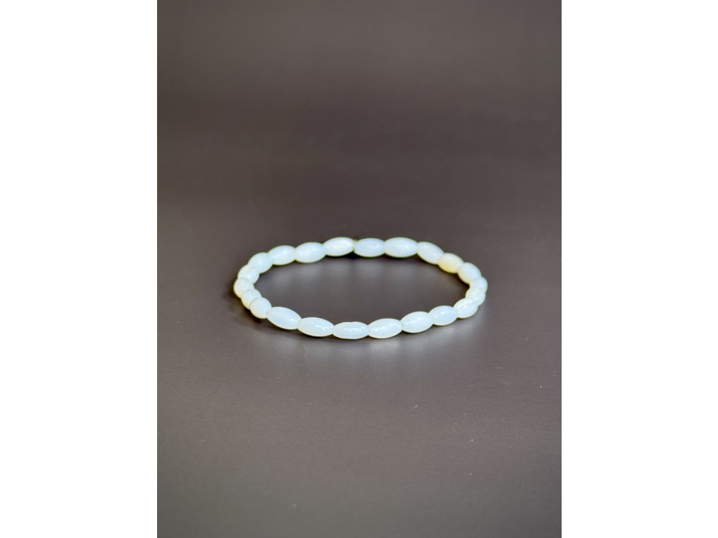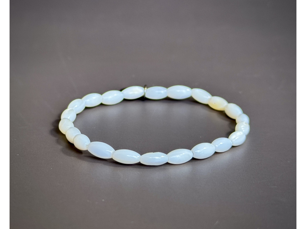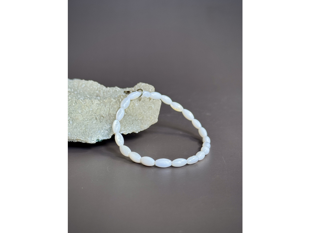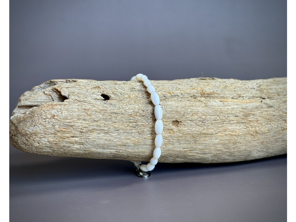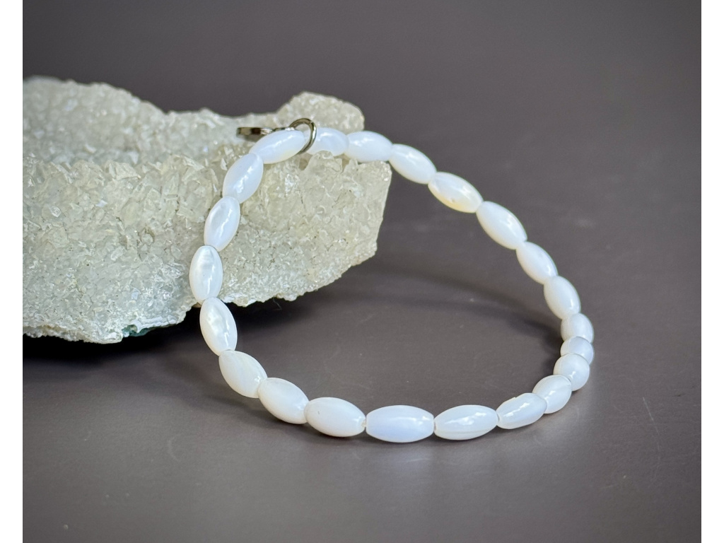 Elegantní náramek z pravé perleti okouzlí svým jemným leskem a čistotou. Přírodní perleť je symbolem harmonie a ženskosti, dodává šperku nadčasový vzhled i jedinečnou energii. Minerály mají zajímavý protáhlý tvar připomínající zrnka rýže, což dává tomuto náramku originální vzhled a výraz.