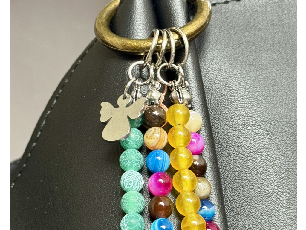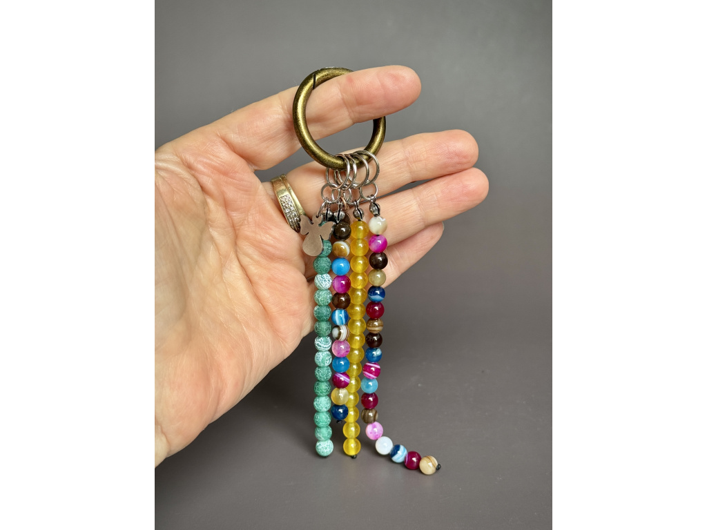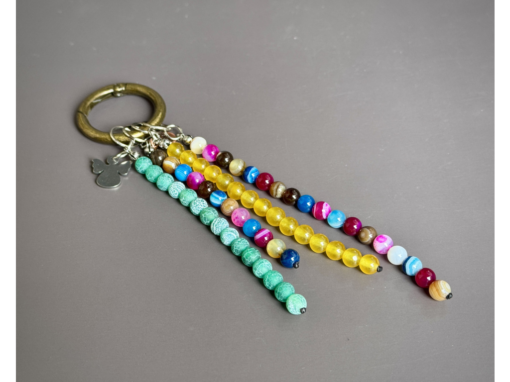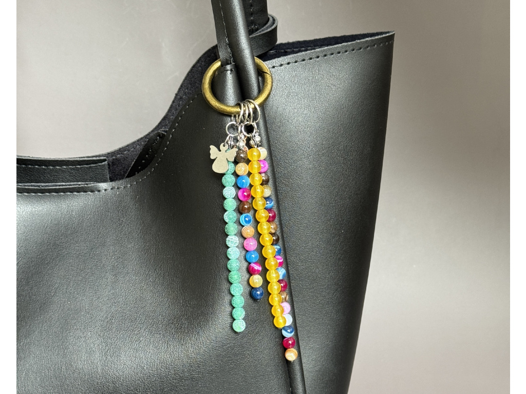 Elegantní a zároveň praktický doplněk, který rozzáří vaši kabelku, klíče, auto, cokoliv. Ručně vyráběný přívěsek kombinuje krásu jadeitu (dobarvovaný), rekonstruovaného zeleného praskaného achátu a achátu v různých barvách od přírodních až dobarvovaných. Každý kámen je originální, přináší ochranu, stabilitu a energii klidu. Karabinka zajišťuje snadné připnutí na kabelku, batoh či jako stylová klíčenka.