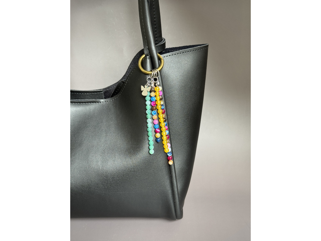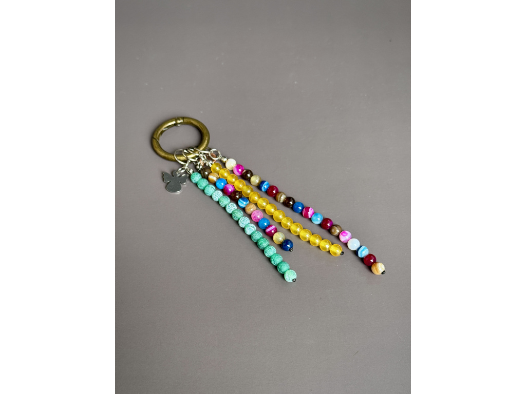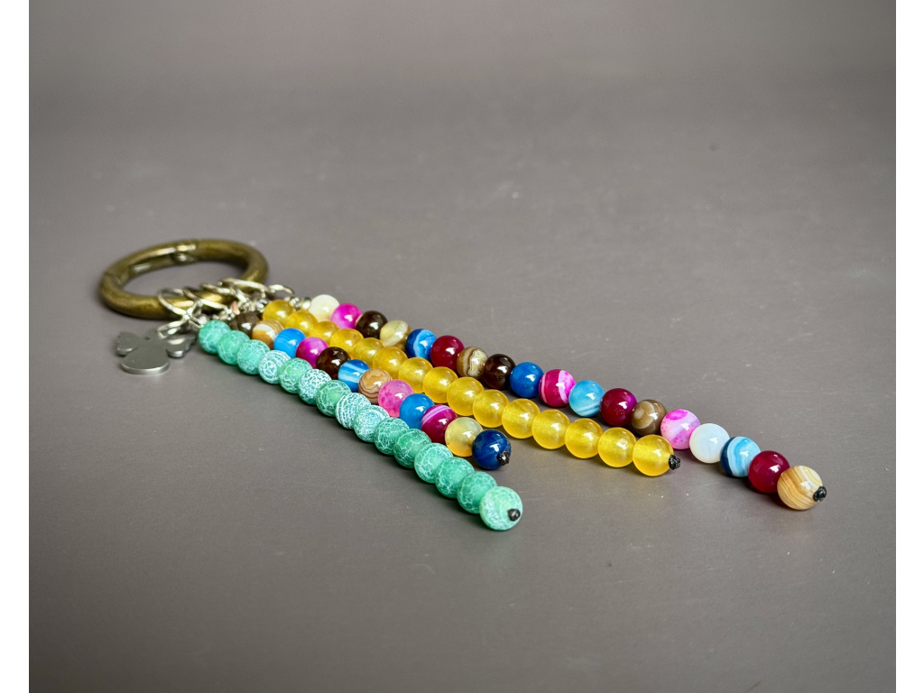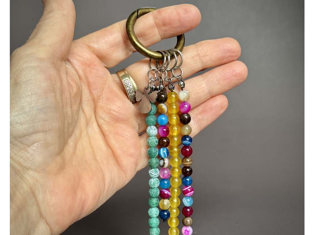 Elegantní a zároveň praktický doplněk, který rozzáří vaši kabelku, klíče, auto, cokoliv. Ručně vyráběný přívěsek kombinuje krásu jadeitu (dobarvovaný), rekonstruovaného zeleného praskaného achátu a achátu v různých barvách od přírodních až dobarvovaných. Každý kámen je originální, přináší ochranu, stabilitu a energii klidu. Karabinka zajišťuje snadné připnutí na kabelku, batoh či jako stylová klíčenka.