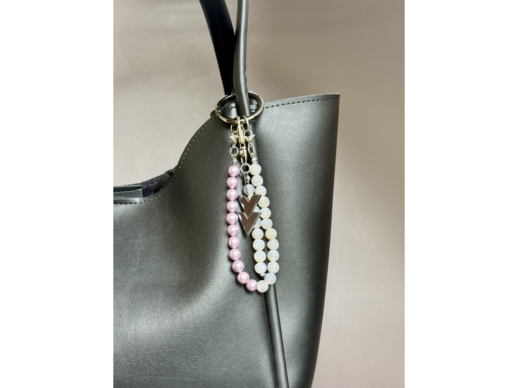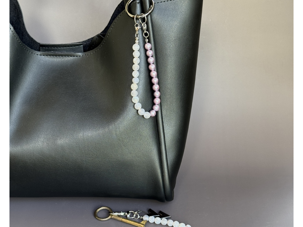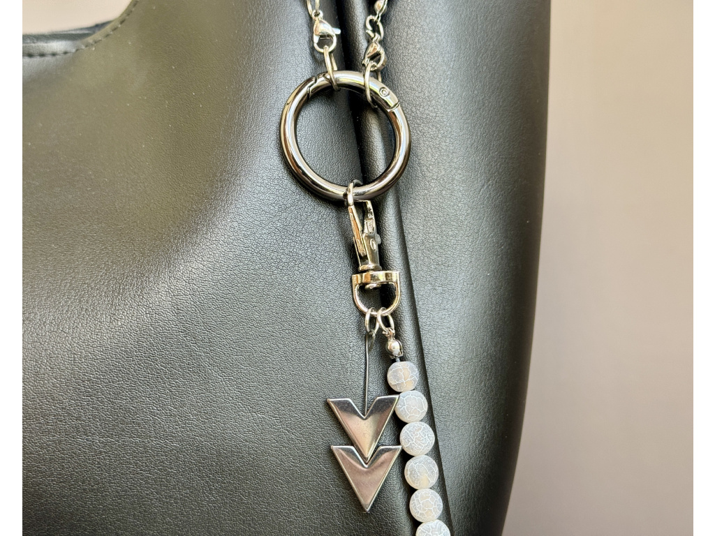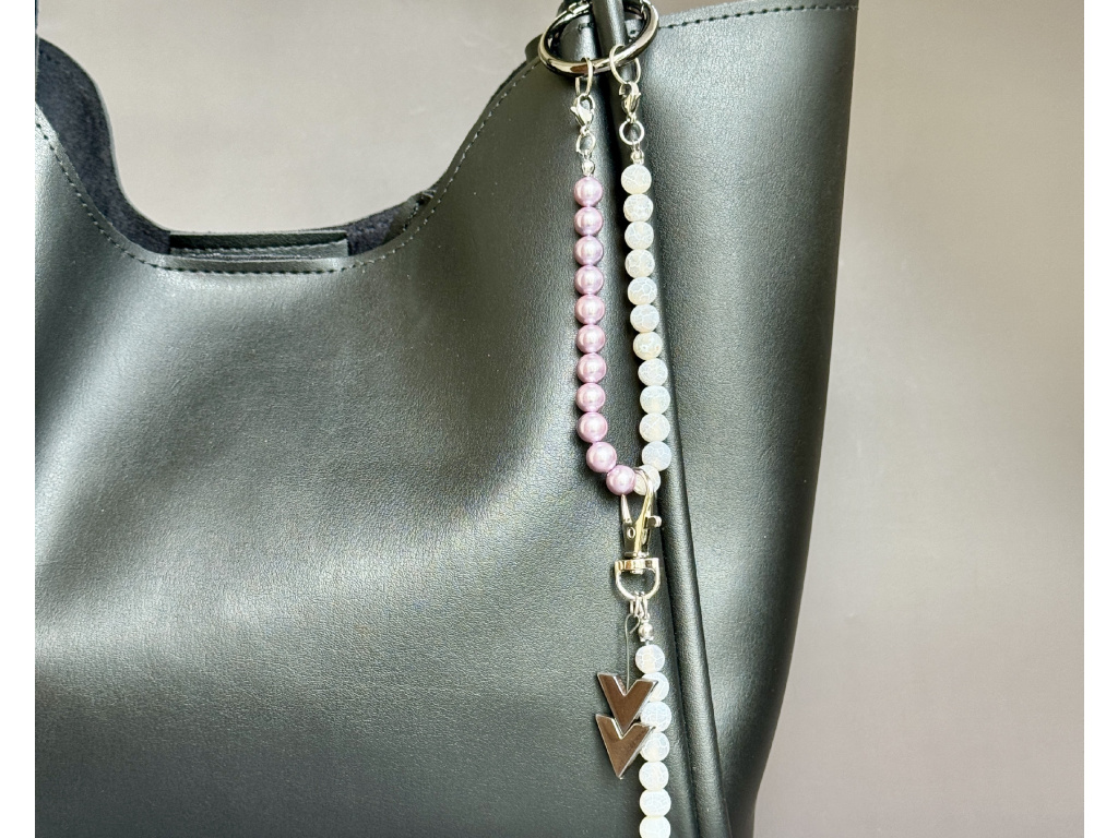 Ozdobte svou kabelku stylovým přívěskem z hematitu v kombinaci s imitací perly lila barvy a achátem šedým praskaným. Hematit je velmi účinný ochranný kámen, který brání negativním energiím ve vstupu do vaší aury a uvádí do rovnováhy tělo, mysl i ducha – harmonizuje energii jin a jang.