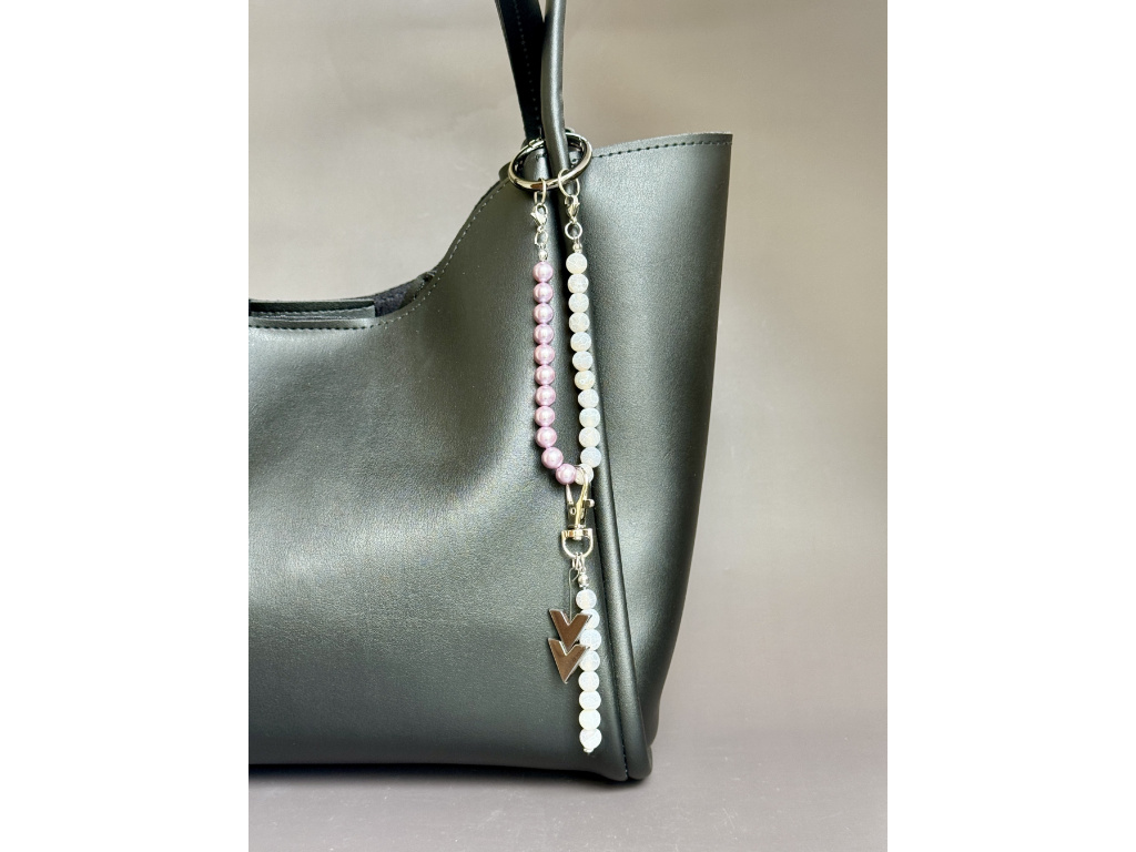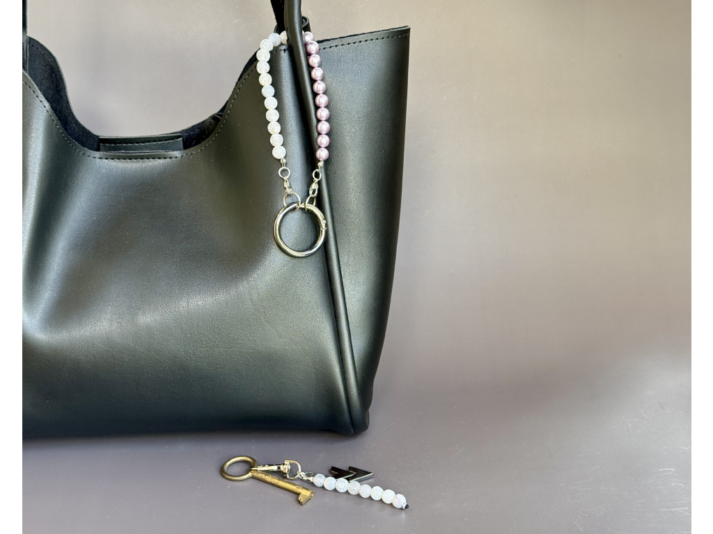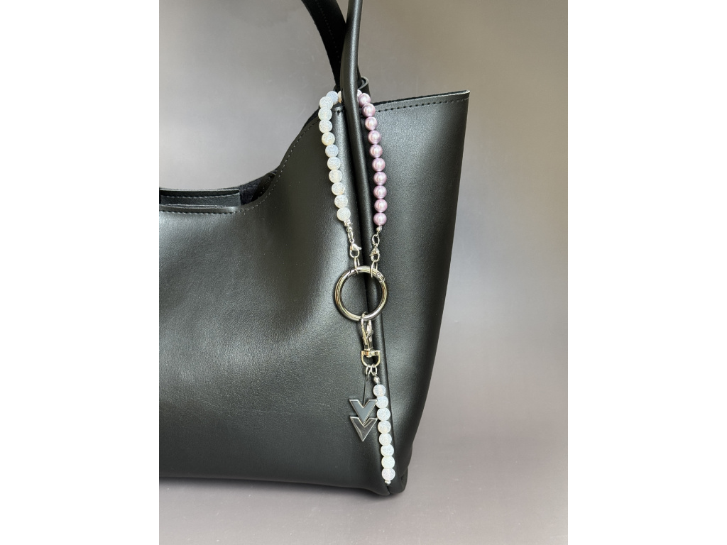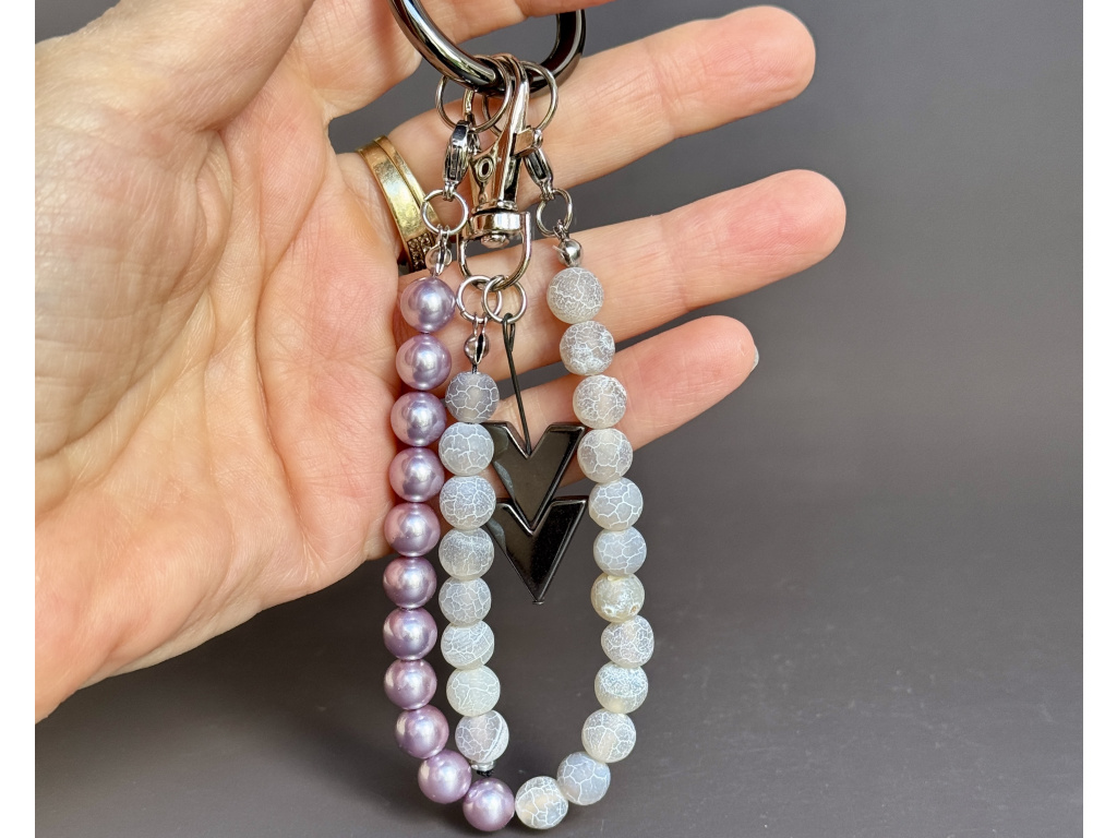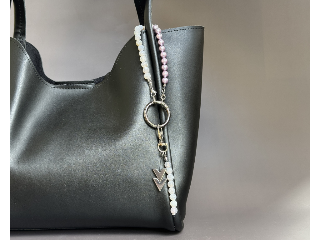 Ozdobte svou kabelku stylovým přívěskem z hematitu v kombinaci s imitací perly lila barvy a achátem šedým praskaným. Hematit je velmi účinný ochranný kámen, který brání negativním energiím ve vstupu do vaší aury a uvádí do rovnováhy tělo, mysl i ducha – harmonizuje energii jin a jang.