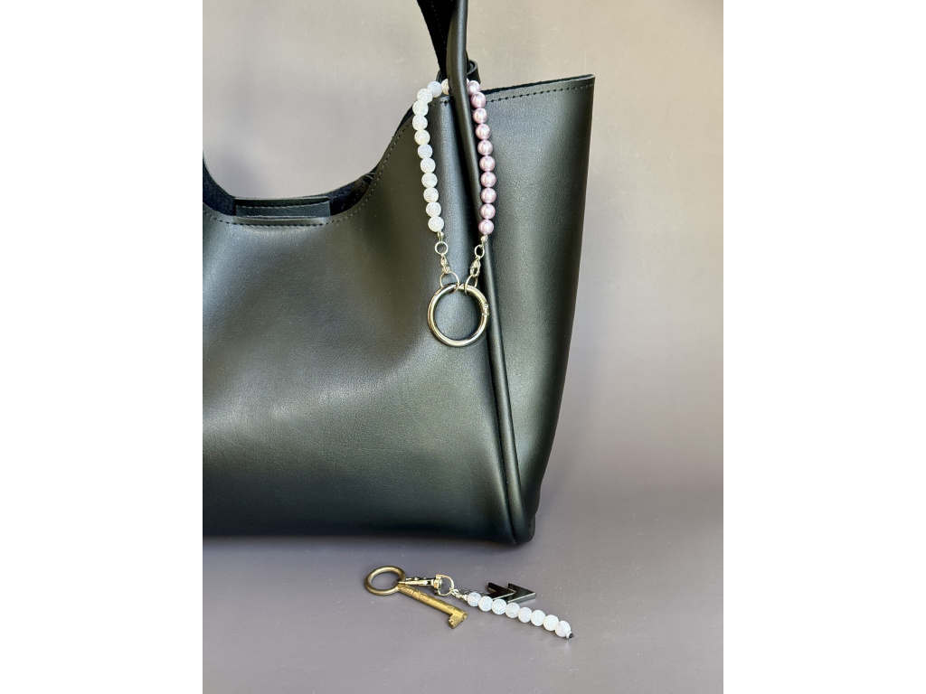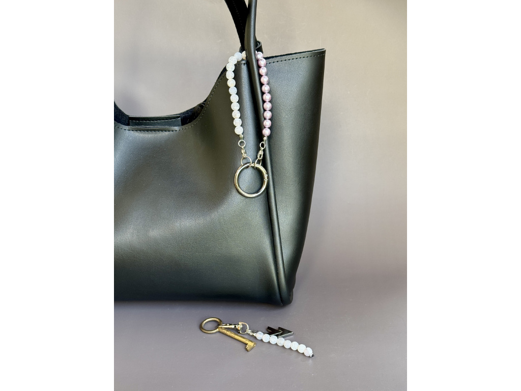 Multifunkční, designový přívěsek na kabelku s hematitem, imitací perly a achátem šedým praskaným (repasovaný achát)