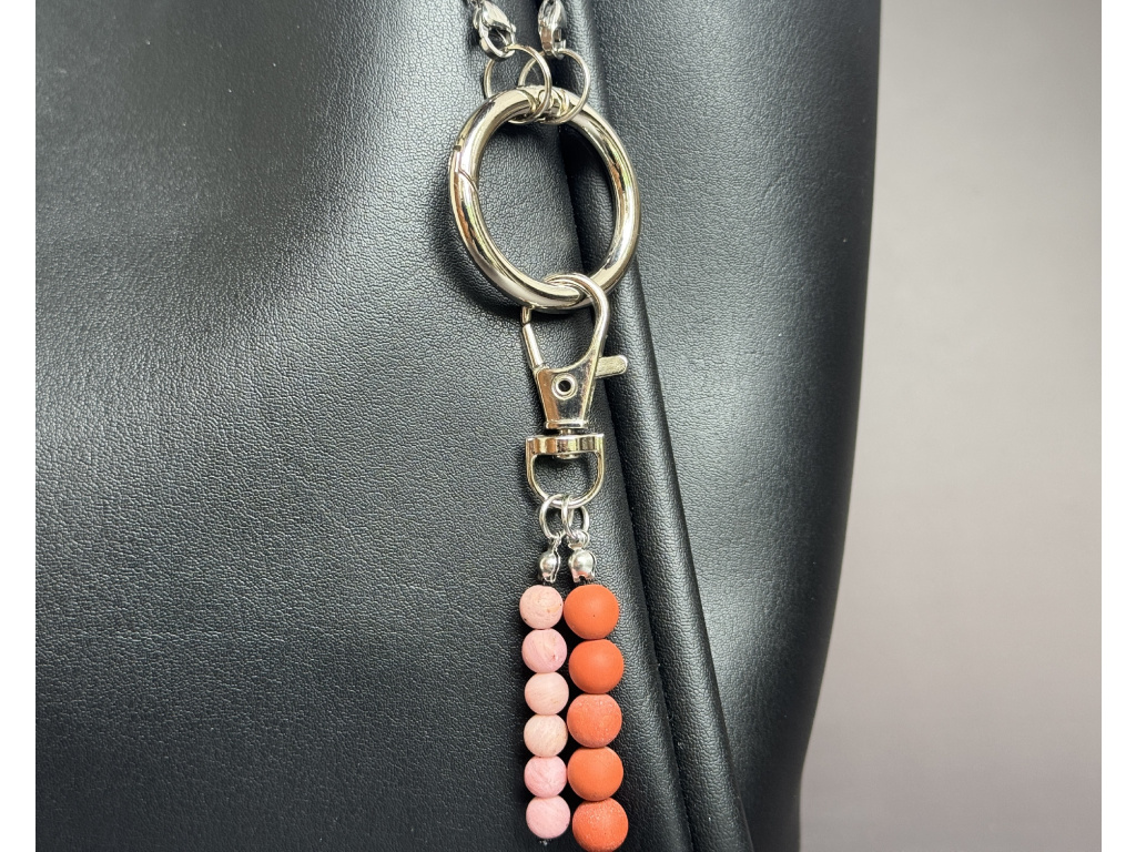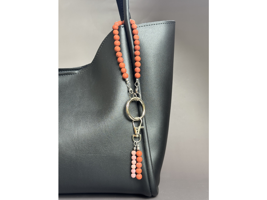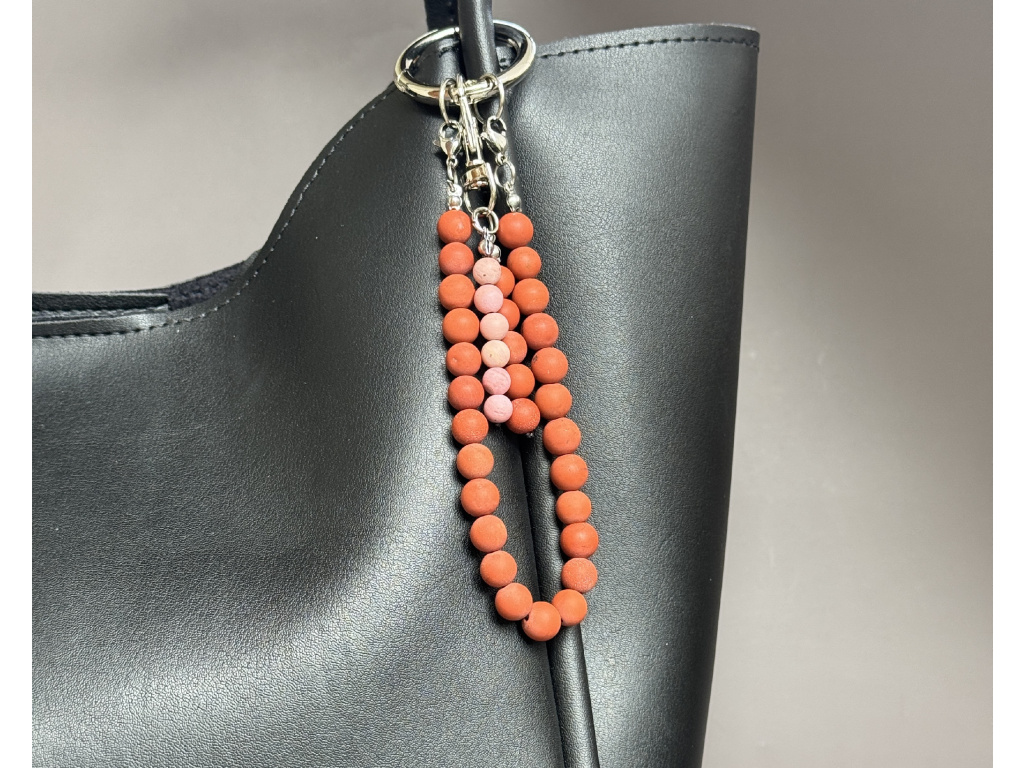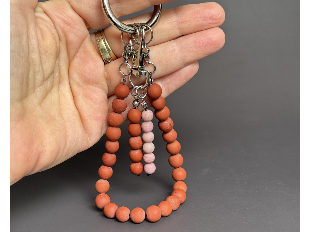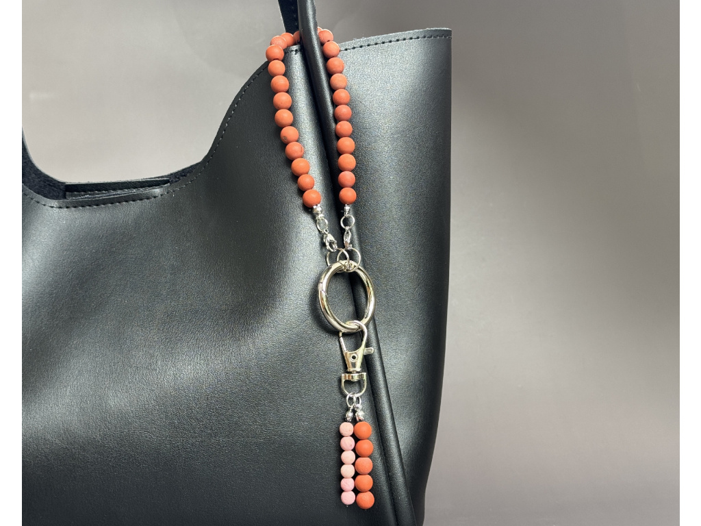 Originální přívěsek z kombinace červeného jaspisu a růžového matného achátu je stylovým i praktickým doplňkem pro každý den. Díky kvalitní karabince jej snadno připevníte na kabelku, batoh nebo ho použijete jako klíčenku. Každý kousek je ručně vyráběný a jedinečný svým vzhledem i energií použitých minerálů.