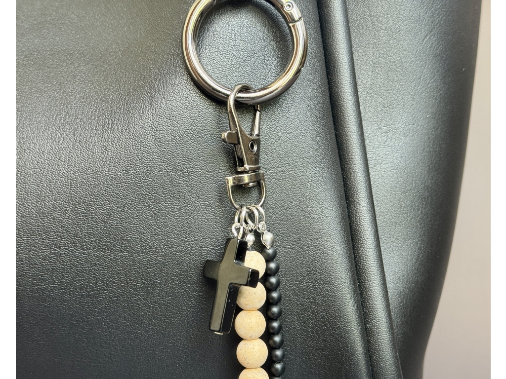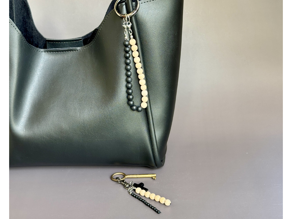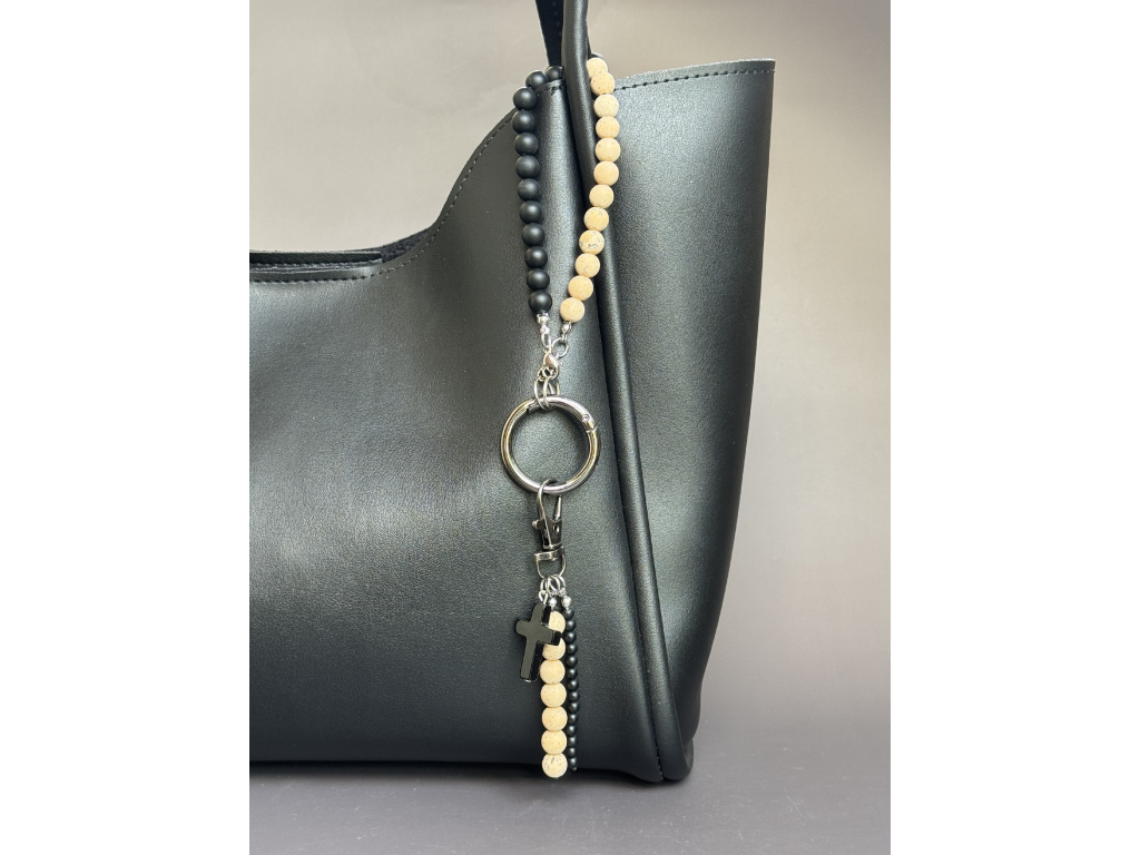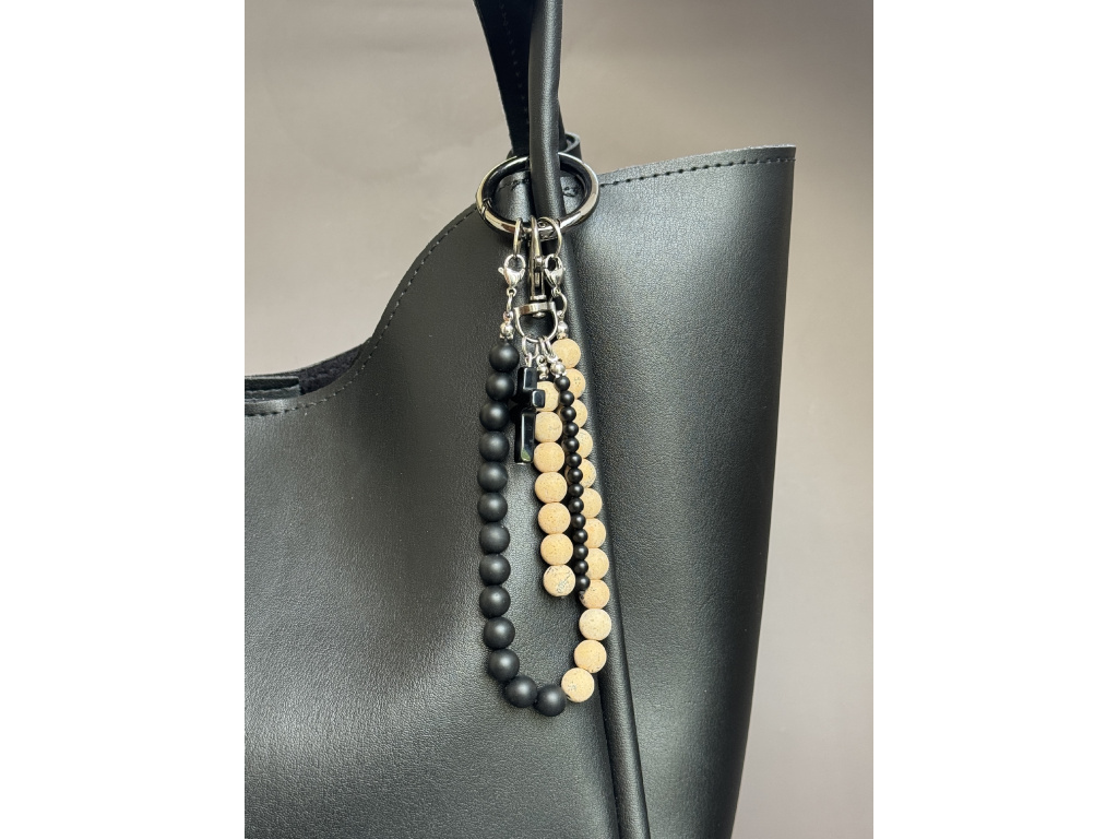 Elegantní a zároveň praktický doplněk, který rozzáří vaši kabelku i klíče. Ručně vyráběný přívěsek kombinuje přírodní krásu obrázkového jaspisu a matného černého achátu. Každý kámen je originální, přináší ochranu, stabilitu a energii klidu. Karabinka zajišťuje snadné připnutí na kabelku, batoh či jako stylový klíčenka.