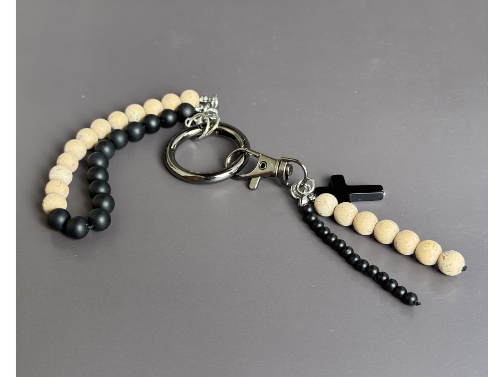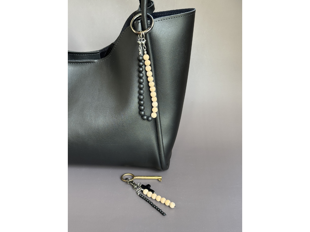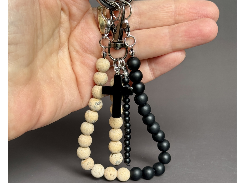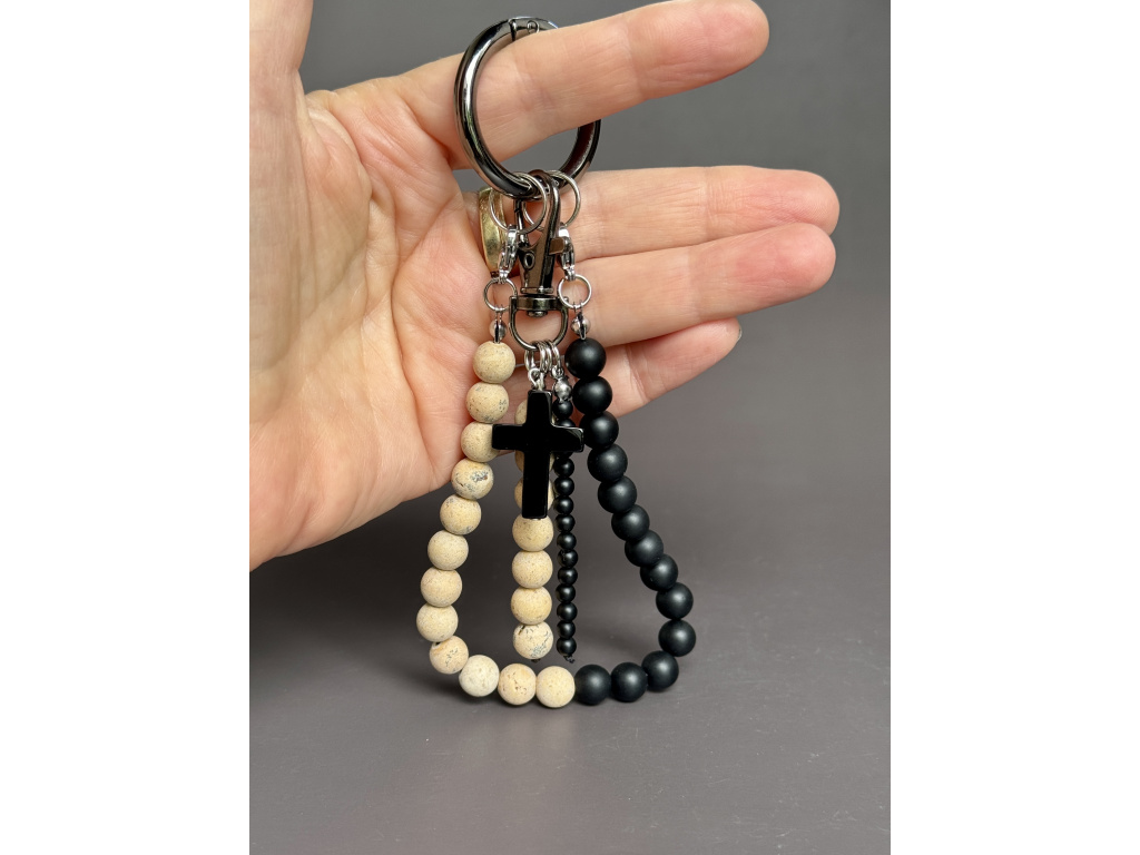 Elegantní a zároveň praktický doplněk, který rozzáří vaši kabelku i klíče. Ručně vyráběný přívěsek kombinuje přírodní krásu obrázkového jaspisu a matného černého achátu. Každý kámen je originální, přináší ochranu, stabilitu a energii klidu. Karabinka zajišťuje snadné připnutí na kabelku, batoh či jako stylový klíčenka.