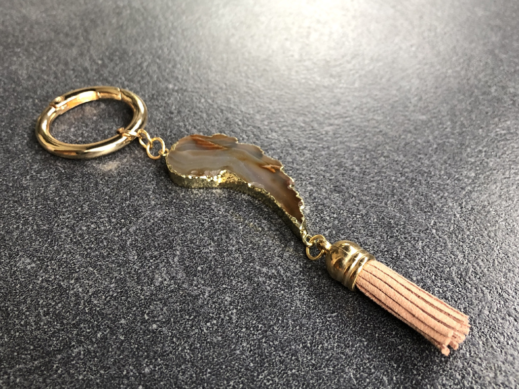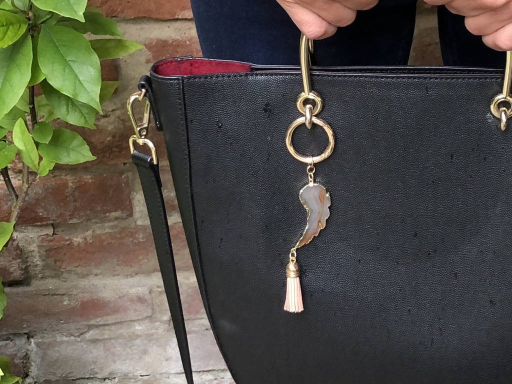 Elegantní přívěsek ve tvaru křídla z achátu dokonale ozdobí každou kabelku. Skvěle se hodí i jako přívěsek na klíče.