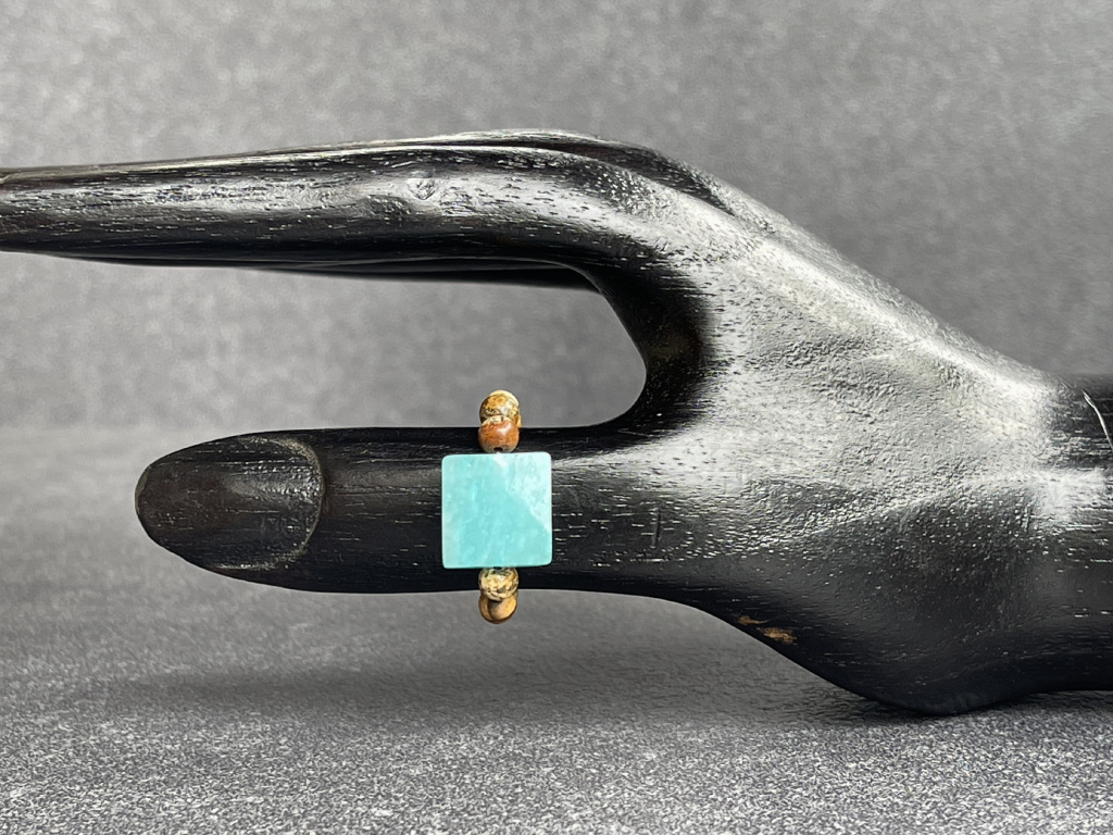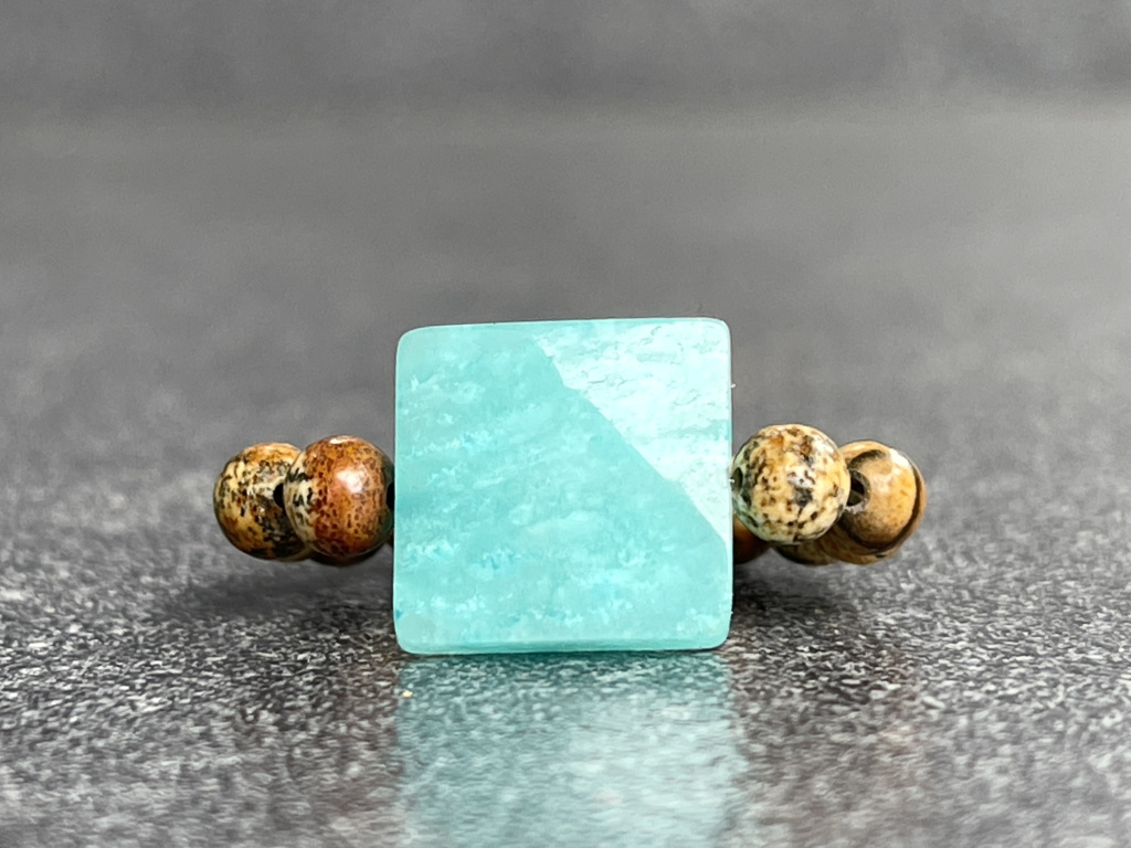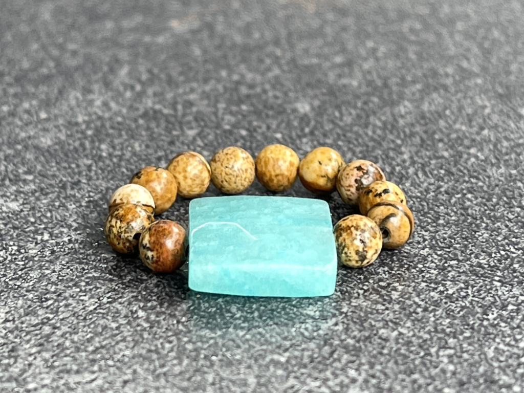 Prstýnek z amazonitu a jaspisu obrázkového je talismanem prosperity a úspěchu. Zmenšuje strach, obavy a navozuje pocit bezpečí.