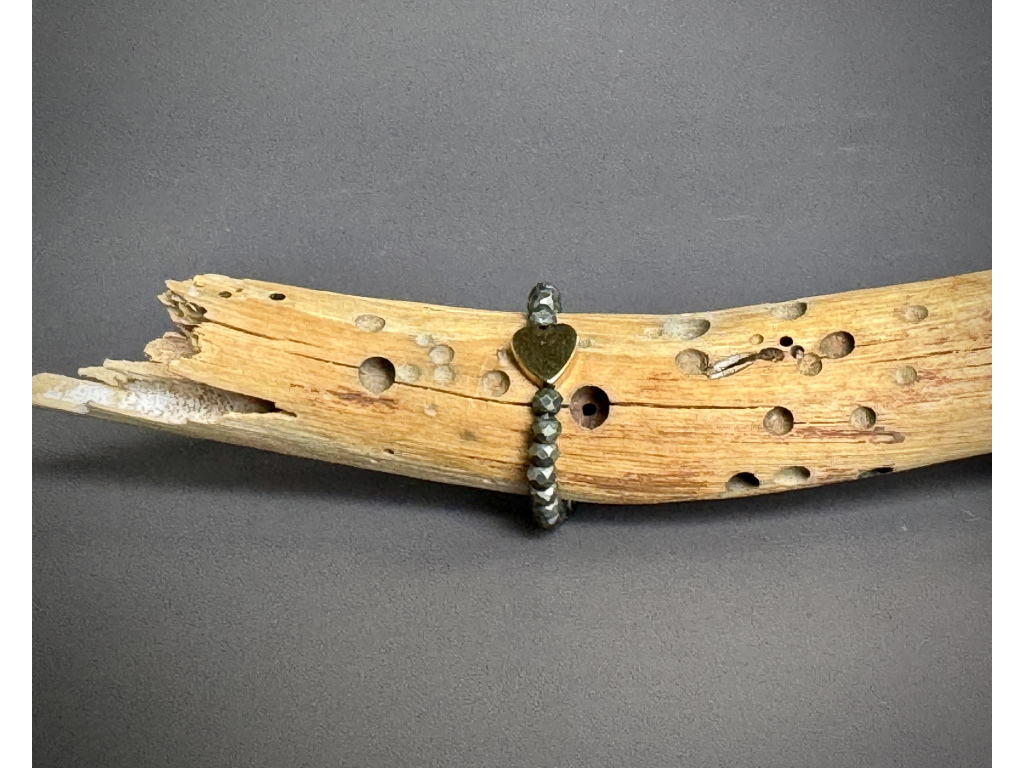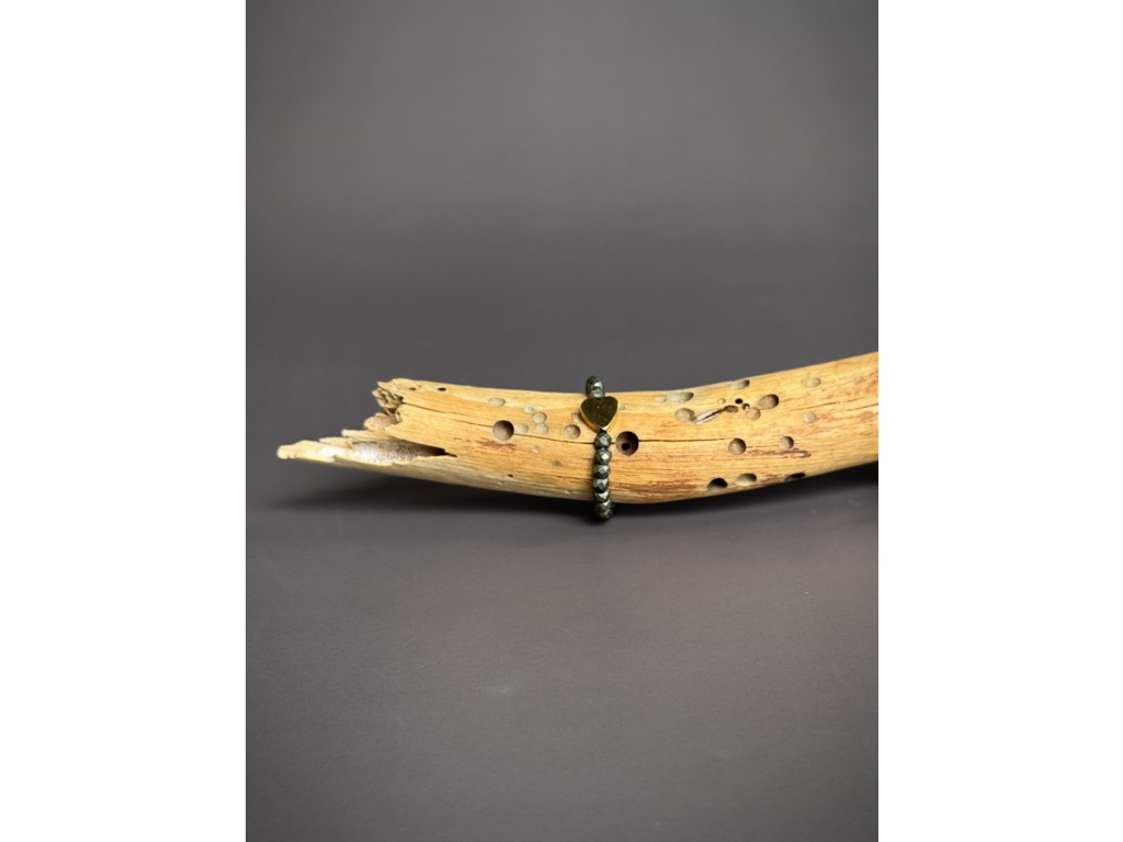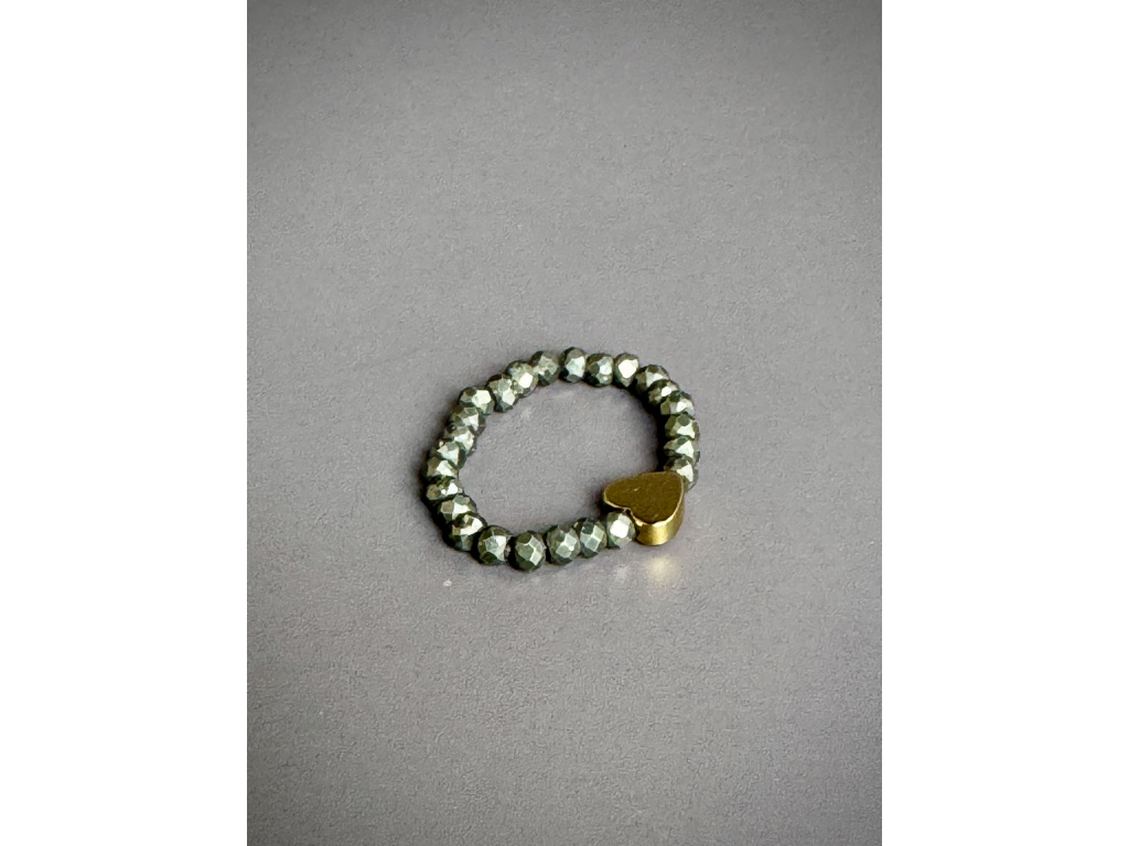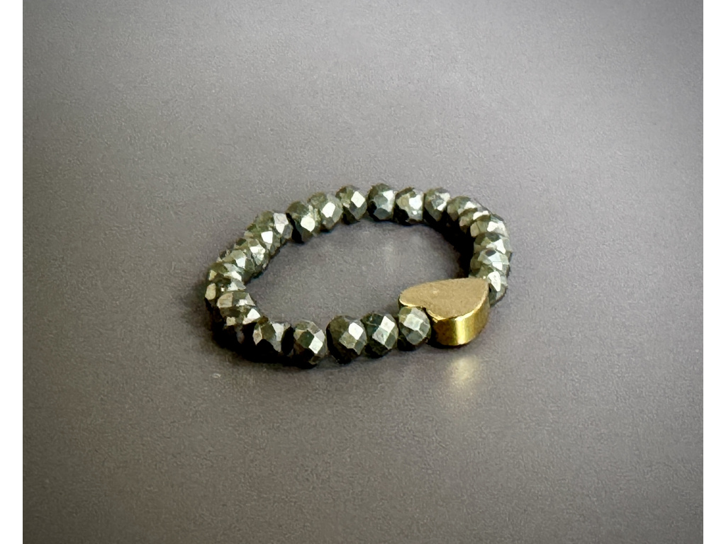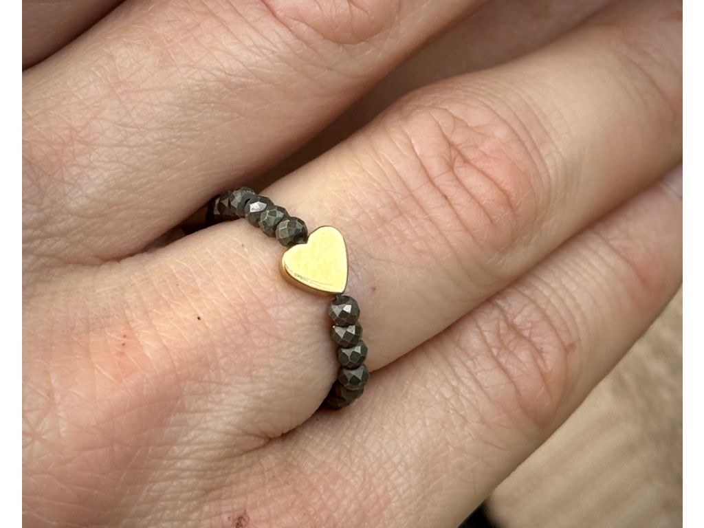 Praktický a zároveň nápaditý doplněk, ve kterém se propojuje síla dvou minerálů s decentním moderním vzhledem. Prsten je ručně vyroben z broušených korálků pyritu a hematitového srdíčka s povrchovou úpravou ve zlatém tónu.
