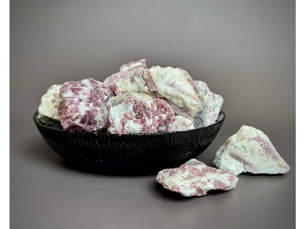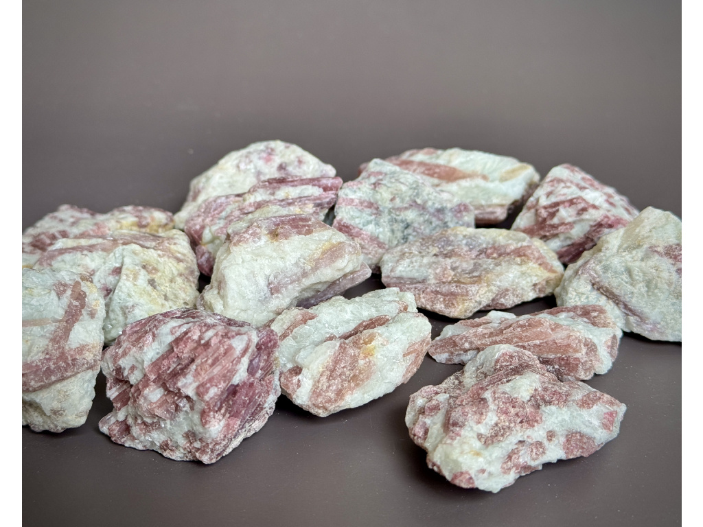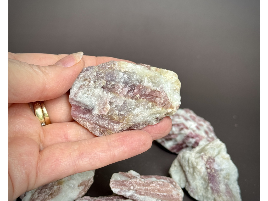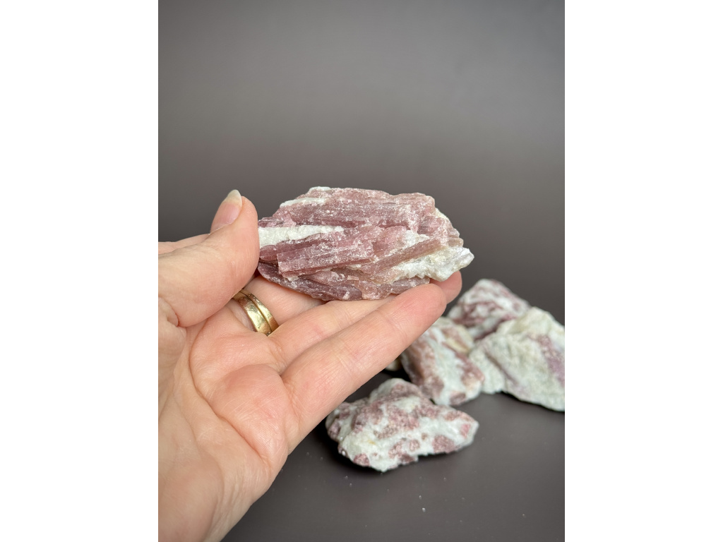 Surový rubelit, růžová odrůda turmalínu, okouzlí jemnými odstíny od malinové po světle růžovou. Jeho přirozená, neleštěná podoba působí syrově a autenticky – jako malý kus živé země, který přináší teplo a dobrou náladu.