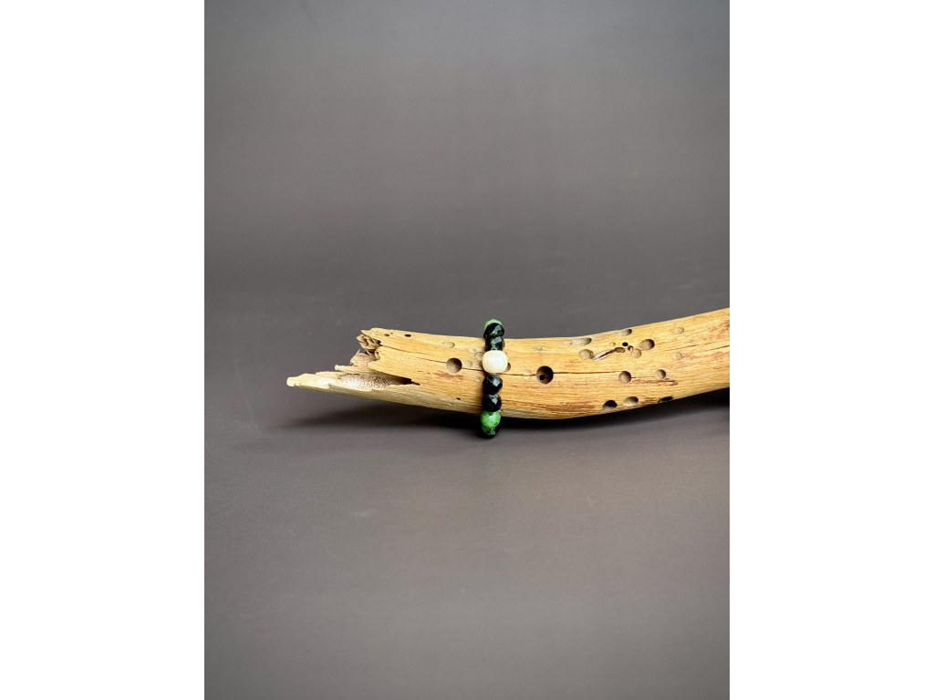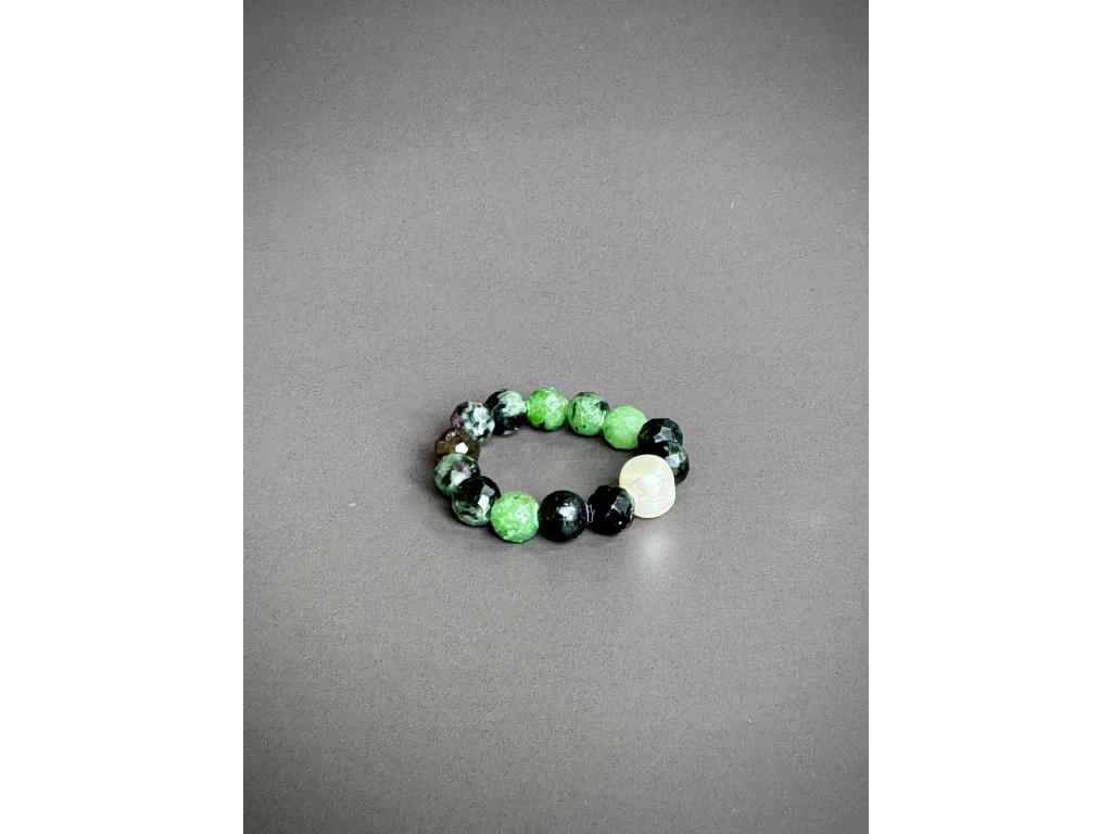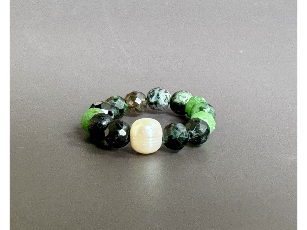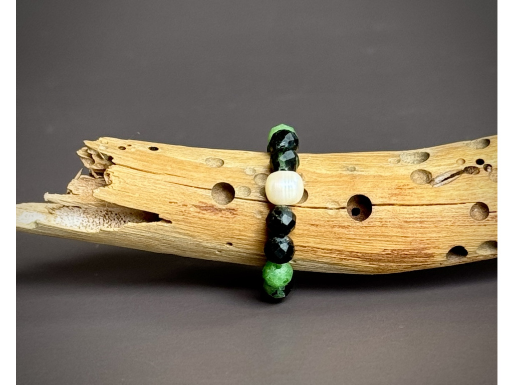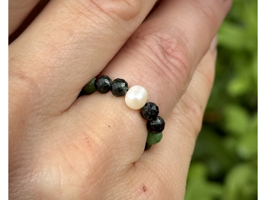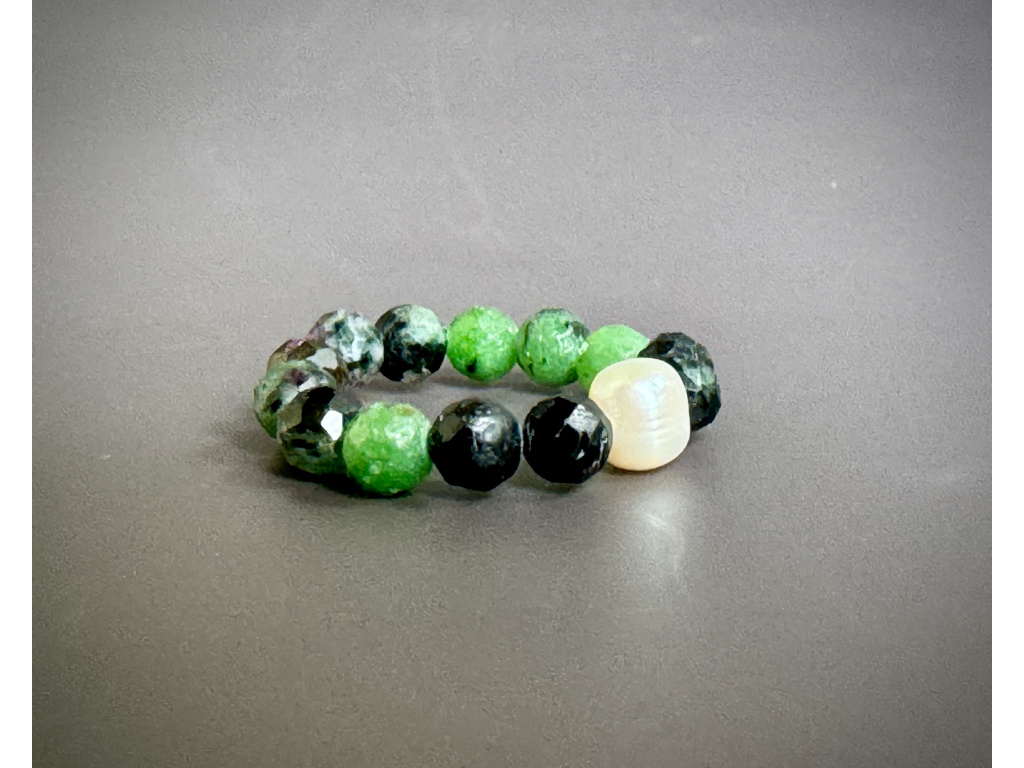 Prstýnek kombinuje přírodní eleganci a výrazné barvy. Ručně navlečené korálky z broušeného rubínu zoisit a decentní říční perla vytváří šperk, který je vhodný jak na běžné nošení, tak i pro slavnostní příležitosti.