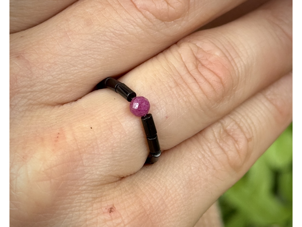 - Jiskra rubínu: facetovaný korálek chytá světlo a dodává prstenu živý akcent.
