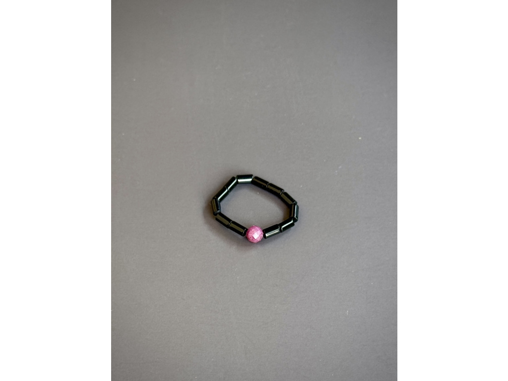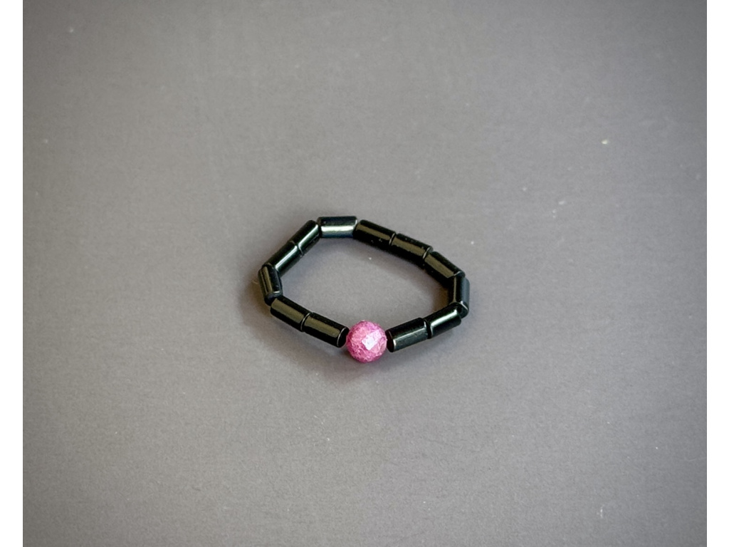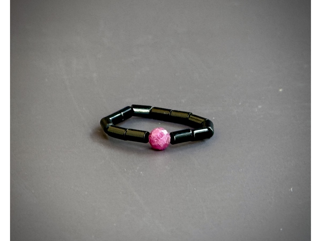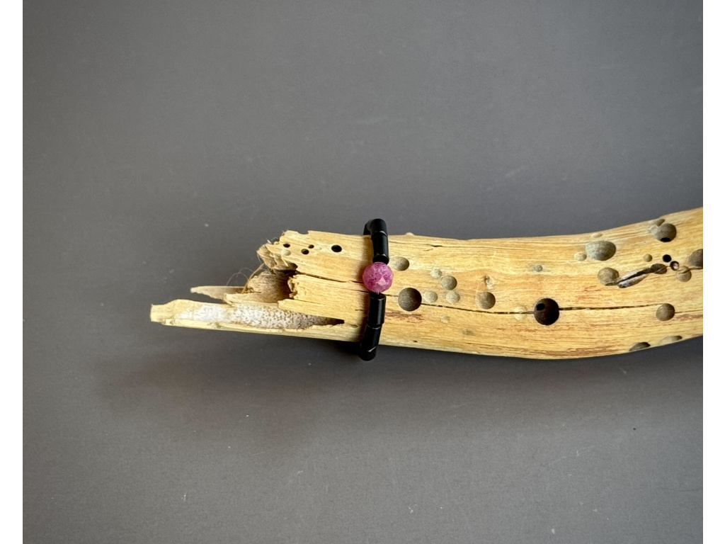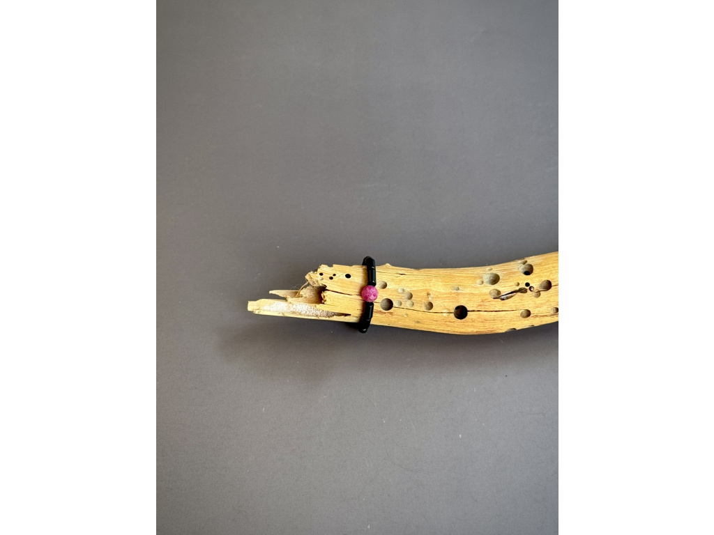 Jemný, moderní kroužek, ve kterém hraje hlavní roli sytě růžový rubín doplněný elegantními válečky z černého achátu. Kontrast barev i tvarů vytváří minimalistický „statement“, který skvěle funguje sólo i ve vrstvení.
