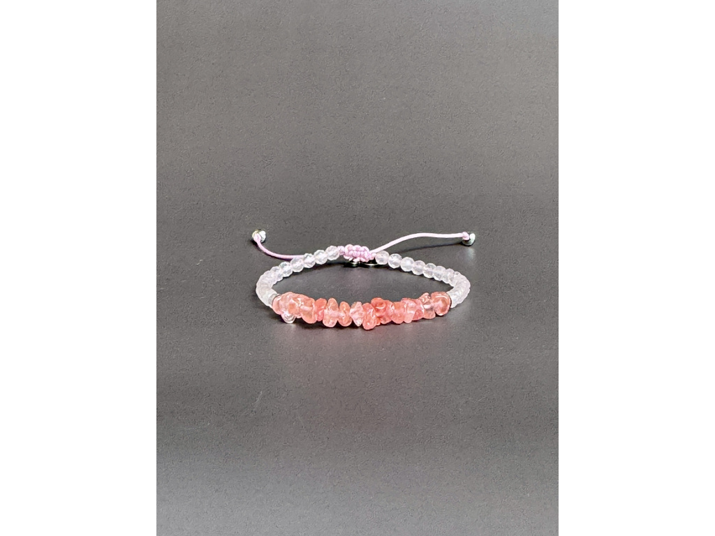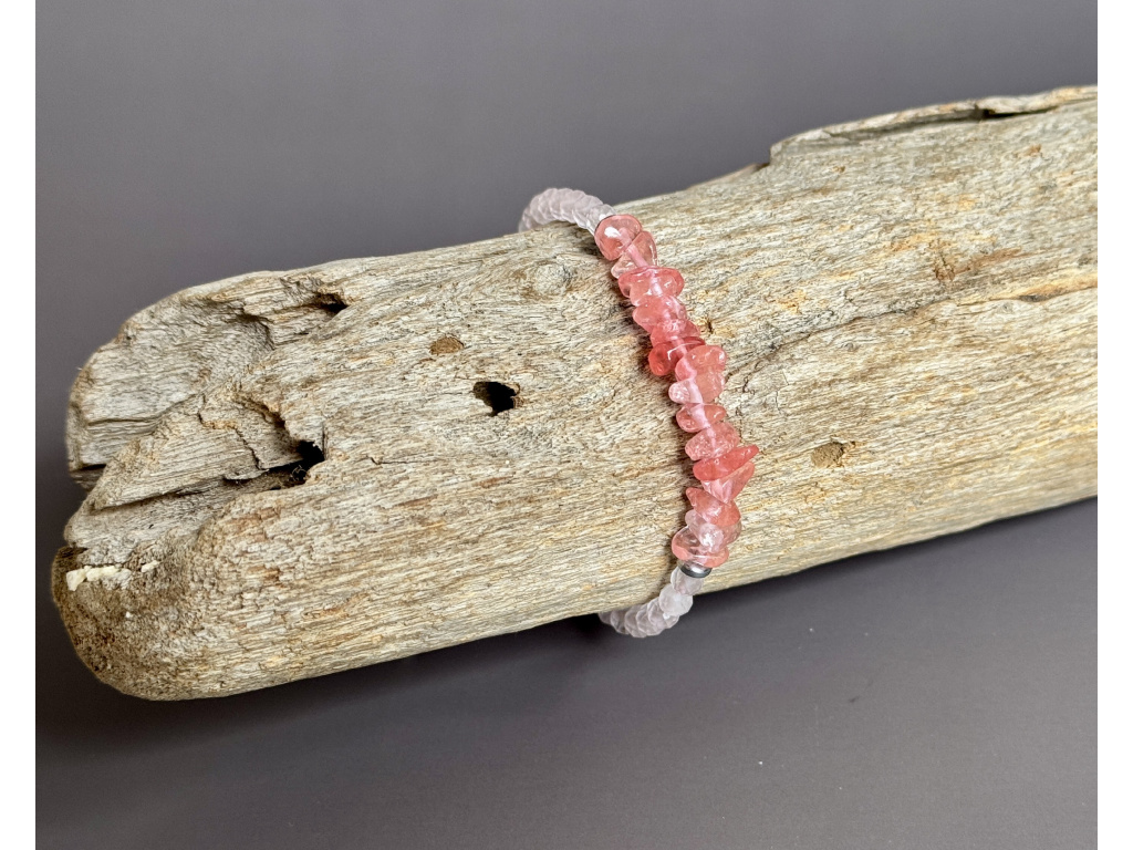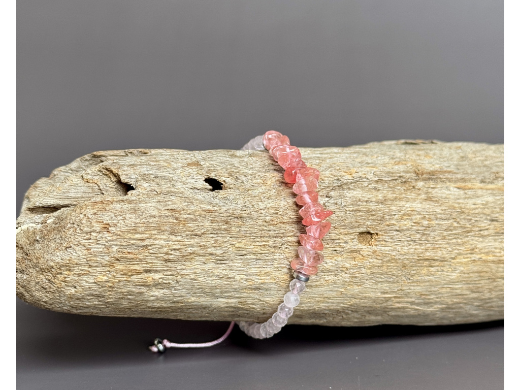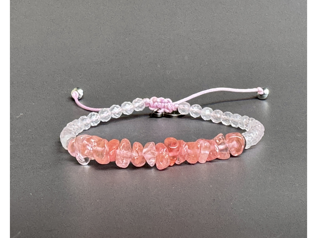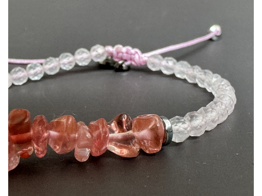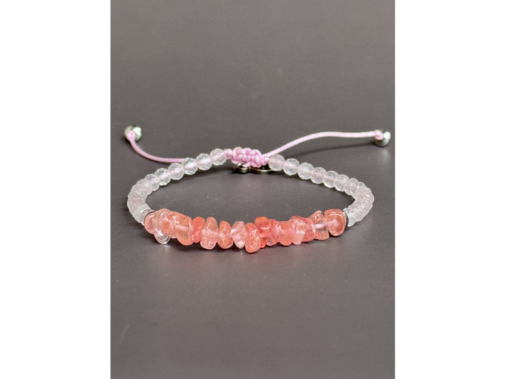 Ručně pletený náramek z růženínových fasetovaných kuliček, sekaného sopečného křemene a hematitových rondelků podporuje zdravou sebelásku, citovou rovnováhu a harmonii těla i duše. Náramek navozuje příjemnou auru plnou lásky ve všech jejích podobách.