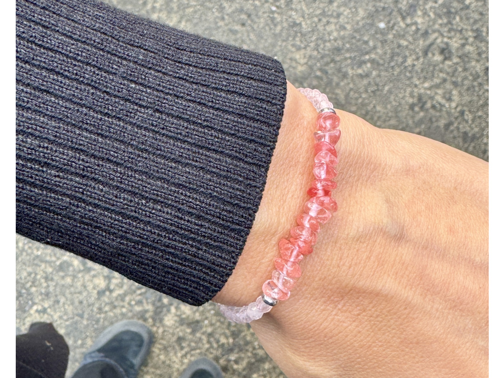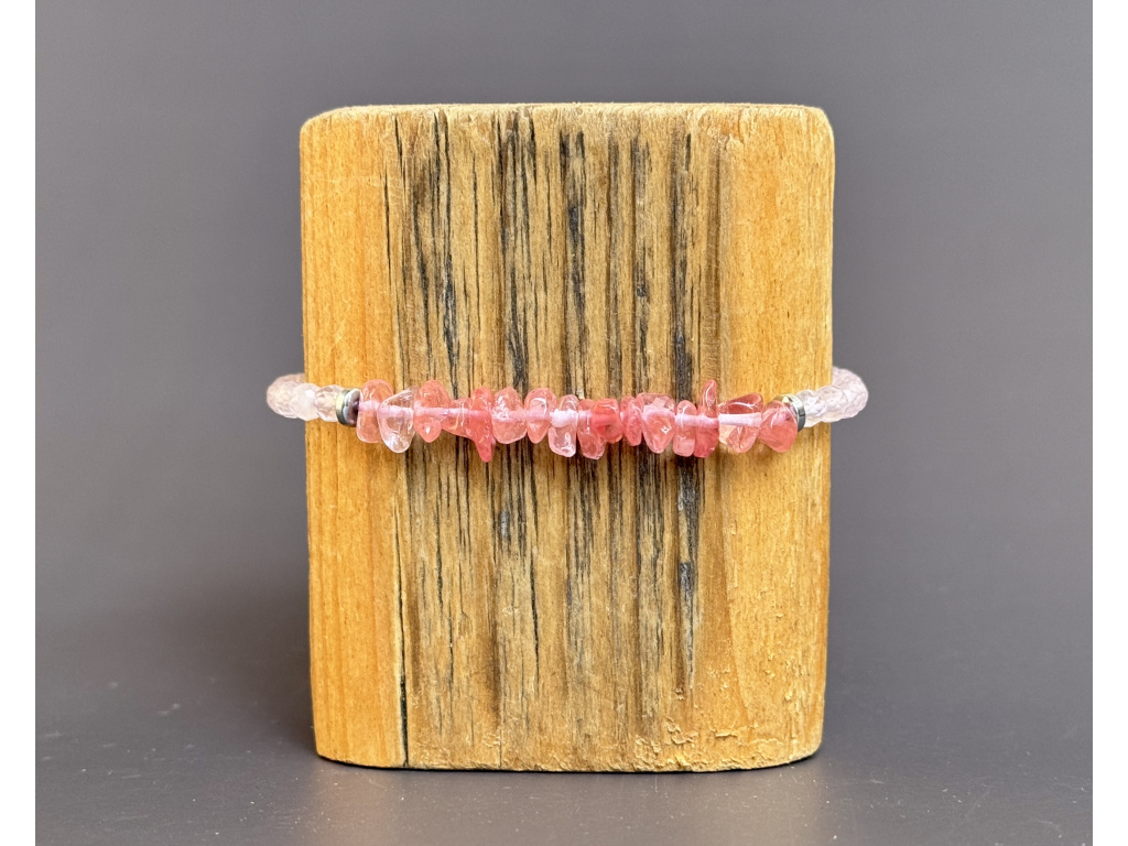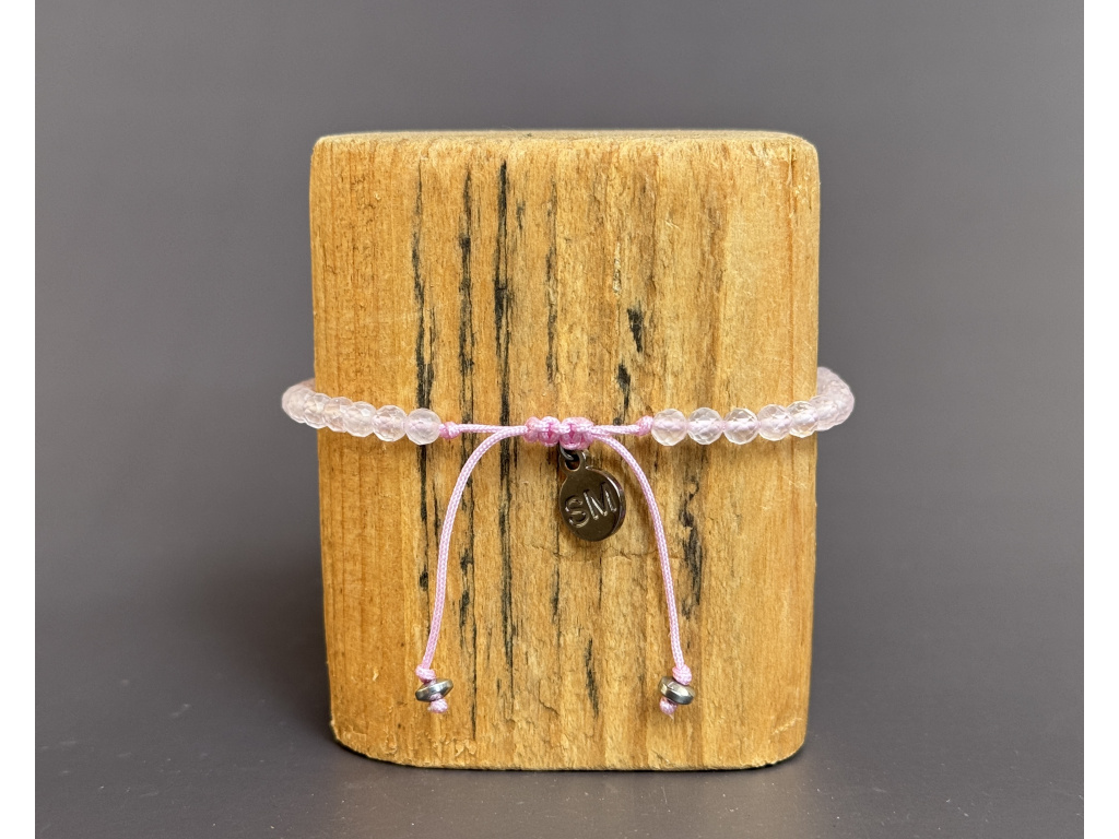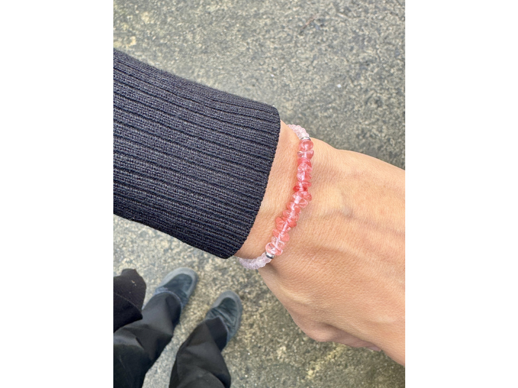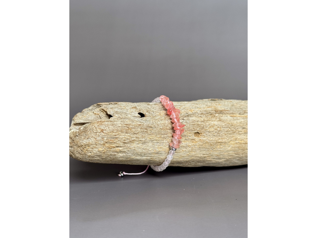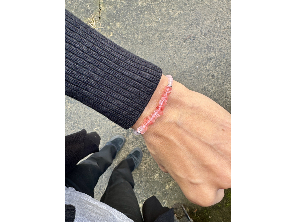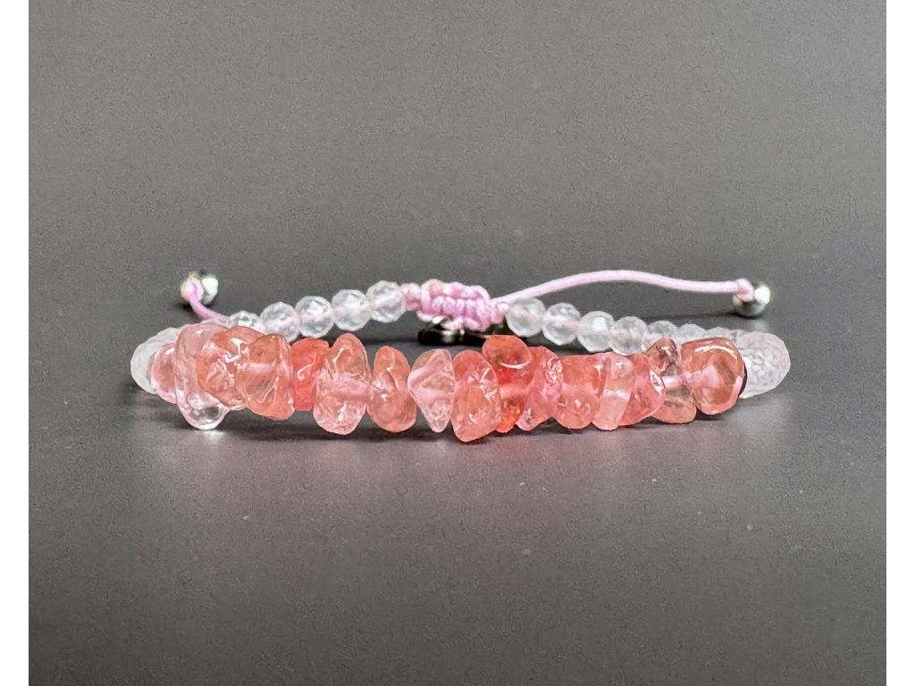 Ručně pletený náramek z růženínových fasetovaných kuliček, sekaného sopečného křemene a hematitových rondelků podporuje zdravou sebelásku, citovou rovnováhu a harmonii těla i duše. Náramek navozuje příjemnou auru plnou lásky ve všech jejích podobách.