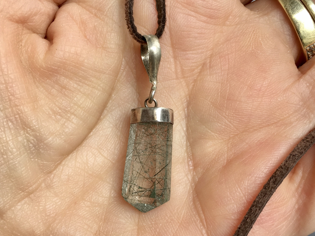 Elegantní přívěsek ze sagenitu, který je ve své přírodní podstatě křišťálem s vrostlicemi trávy. Sagenit je účinný posilovač, čistič, harmonizují a ochranný kámen proti negativním vlivům z okolí.