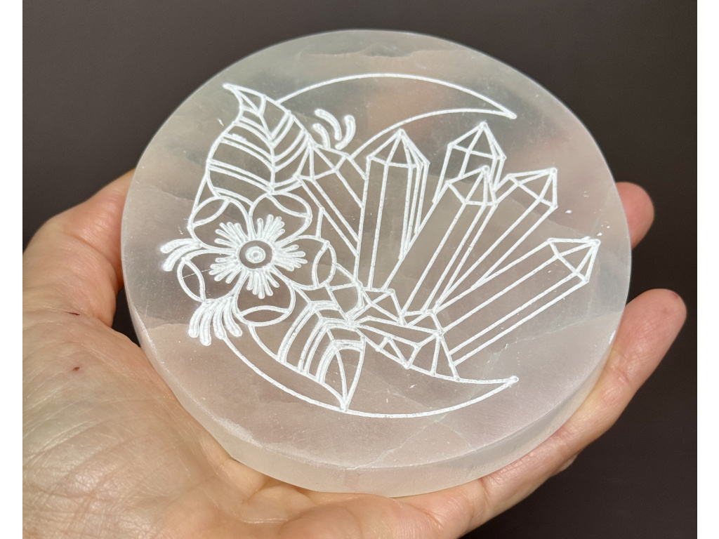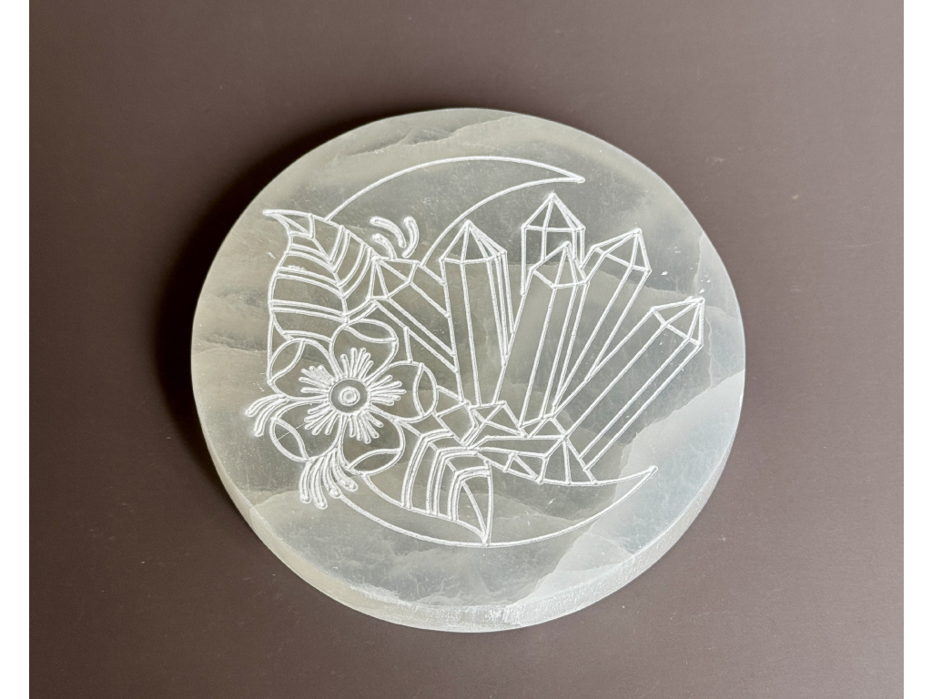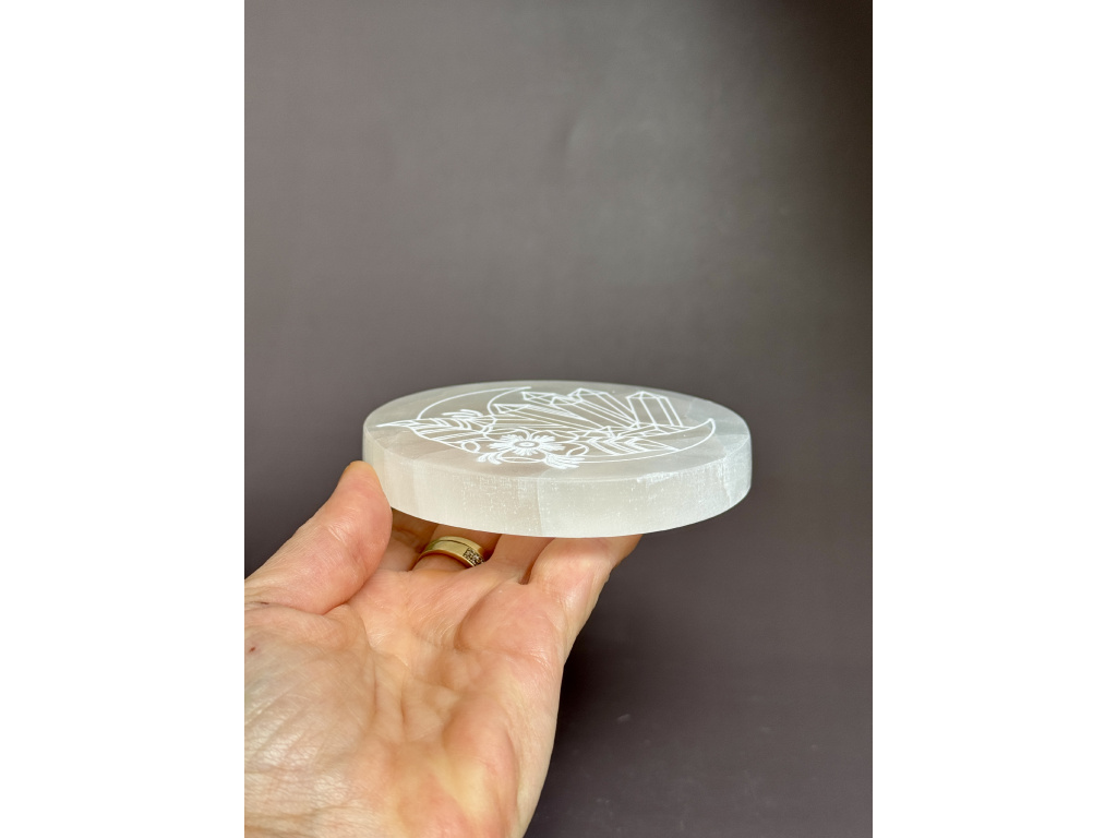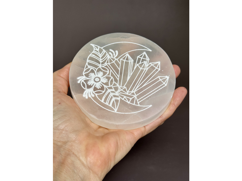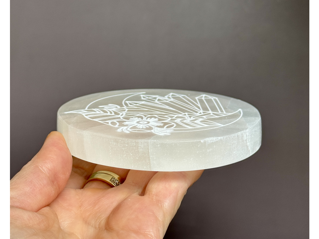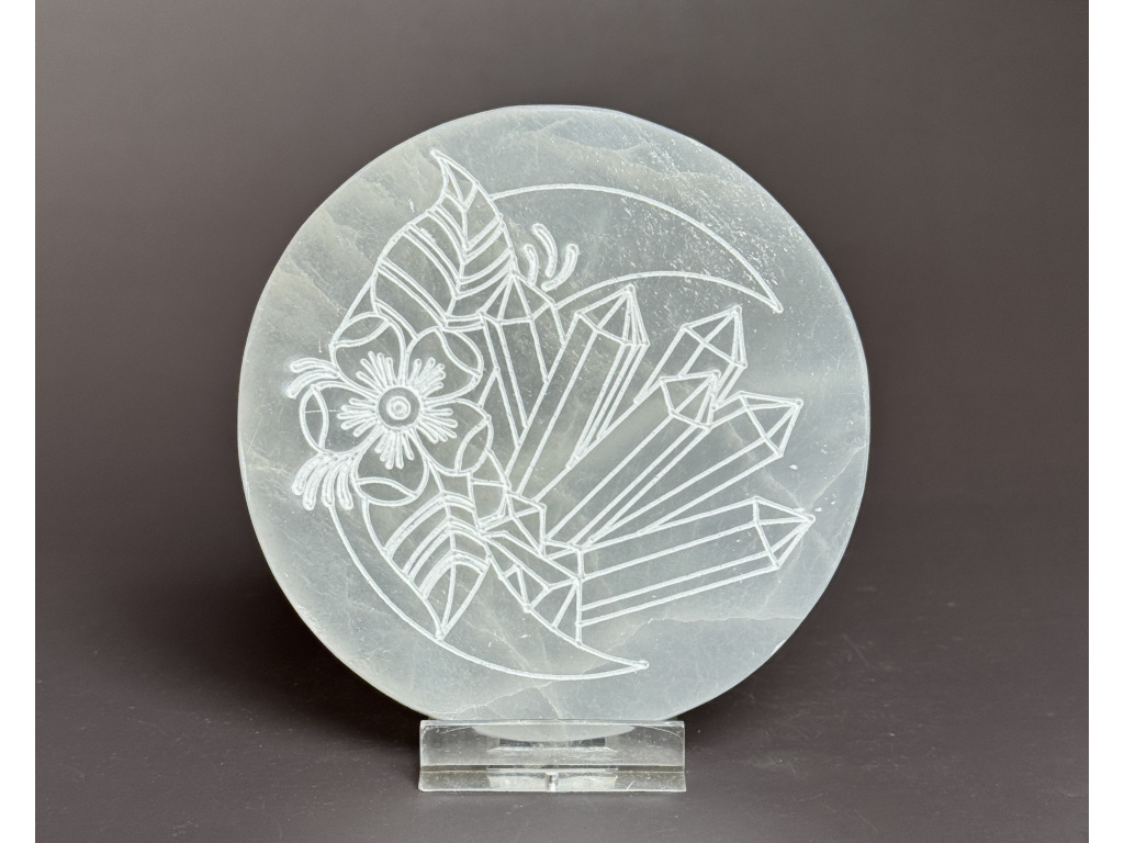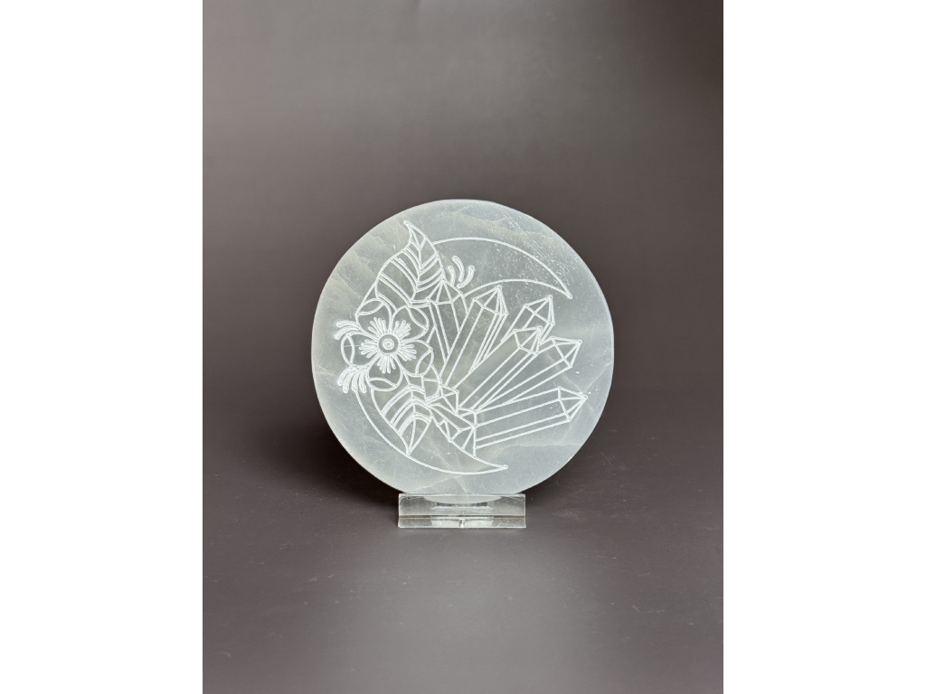 Objevte kouzlo čisté měsíční energie, krystalů a přírody v jediné selenitové destičce. Jemný, ručně vyrytý motiv měsíce, krystalů a květin přináší do vašeho prostoru harmonii, spojení se Zemí i vesmírem a novou dávku inspirace.
