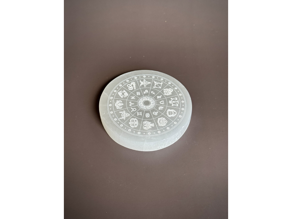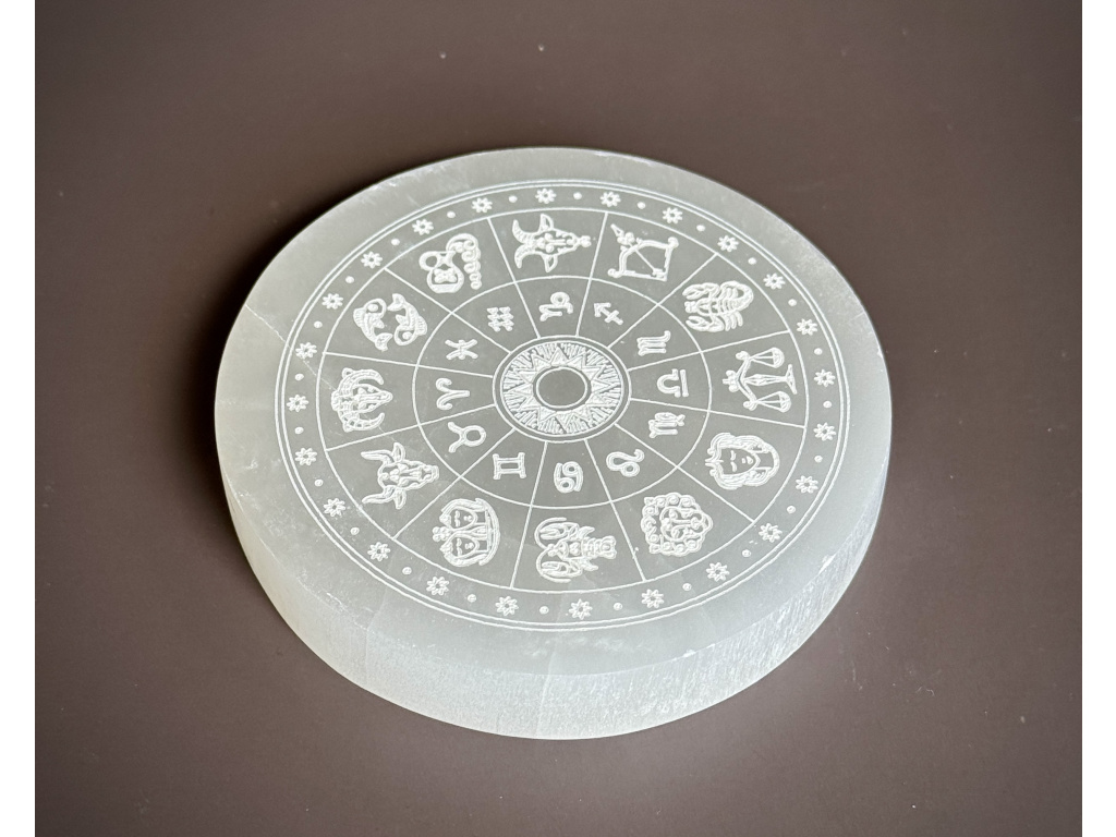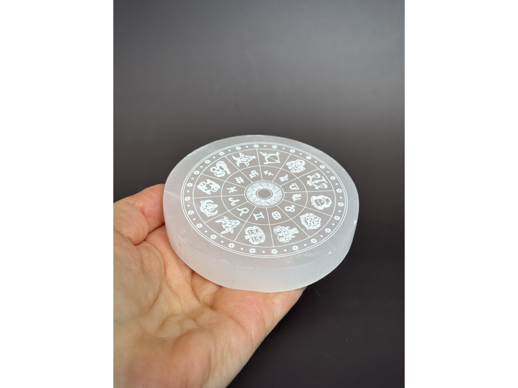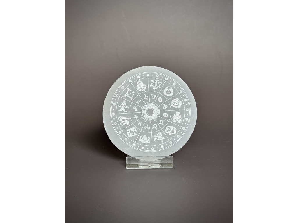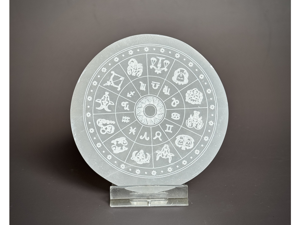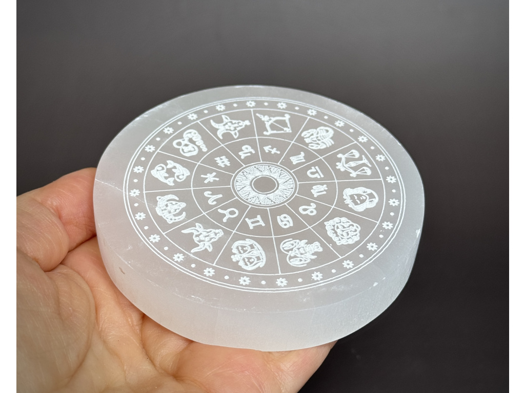 Vneste do svého prostoru záři měsíční energie se selenitovou dobíjecí destičkou v designu zvěrokruju. Selenit je výjimečný kámen známý svou silnou očistnou a harmonizační energií. Díky jemnému a zároveň mocnému působení selenitu se stává ideálním pomocníkem pro pravidelné energetické očistění a dobíjení vašich oblíbených krystalů, minerálů nebo šperků.