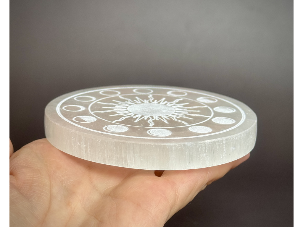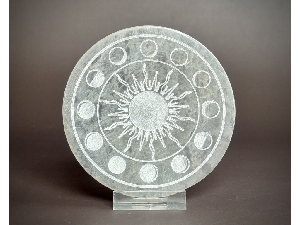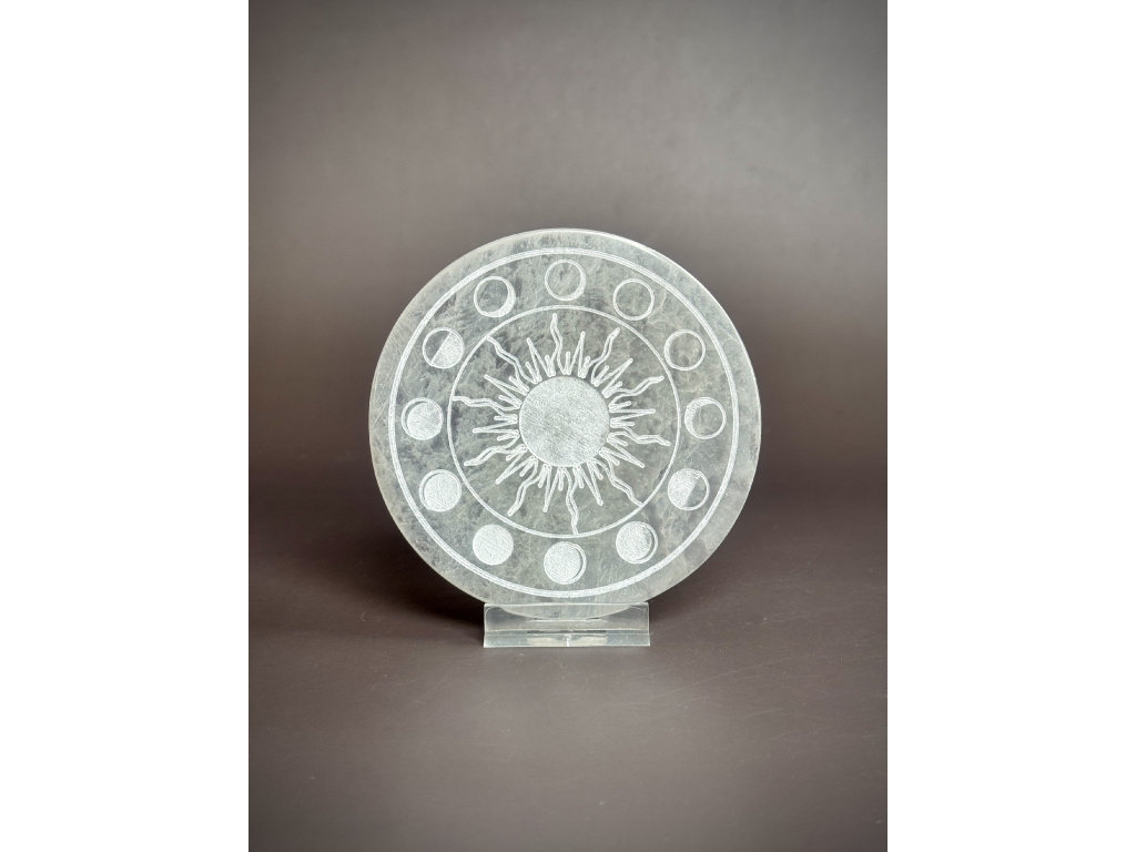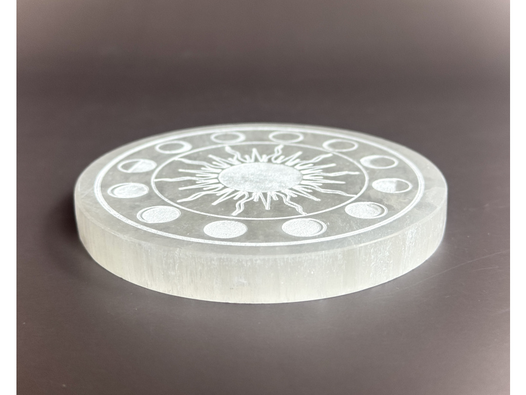 Vneste do svého prostoru záři měsíční energie se selenitovou dobíjecí destičkou v designu měsíčních fází. Selenit je výjimečný kámen známý svou silnou očistnou a harmonizační energií. Díky jemnému a zároveň mocnému působení selenitu se stává ideálním pomocníkem pro pravidelné energetické očistění a dobíjení vašich oblíbených krystalů, minerálů nebo šperků.