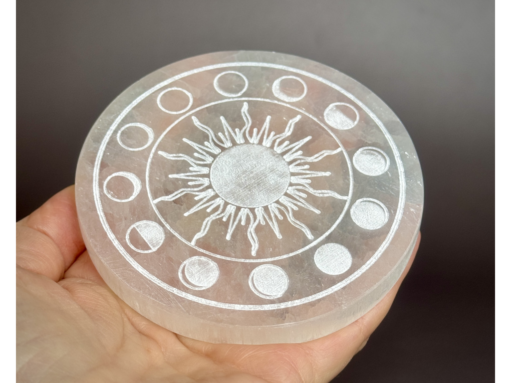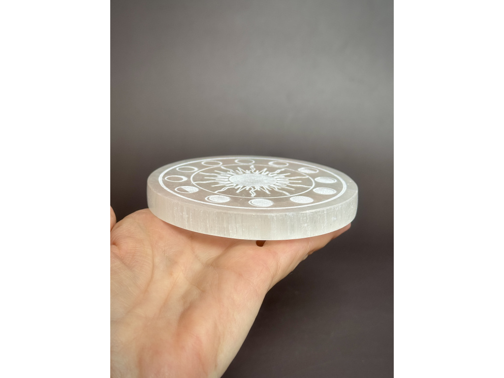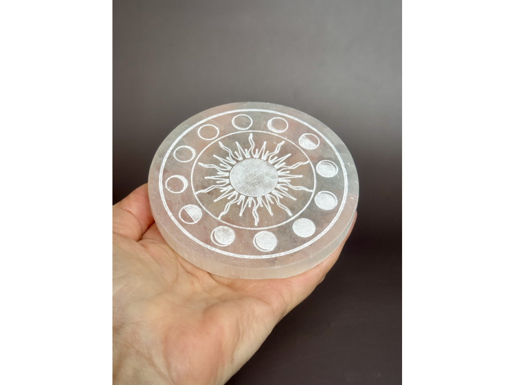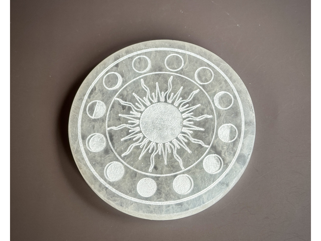 Vneste do svého prostoru záři měsíční energie se selenitovou dobíjecí destičkou v designu měsíčních fází. Selenit je výjimečný kámen známý svou silnou očistnou a harmonizační energií. Díky jemnému a zároveň mocnému působení selenitu se stává ideálním pomocníkem pro pravidelné energetické očistění a dobíjení vašich oblíbených krystalů, minerálů nebo šperků.