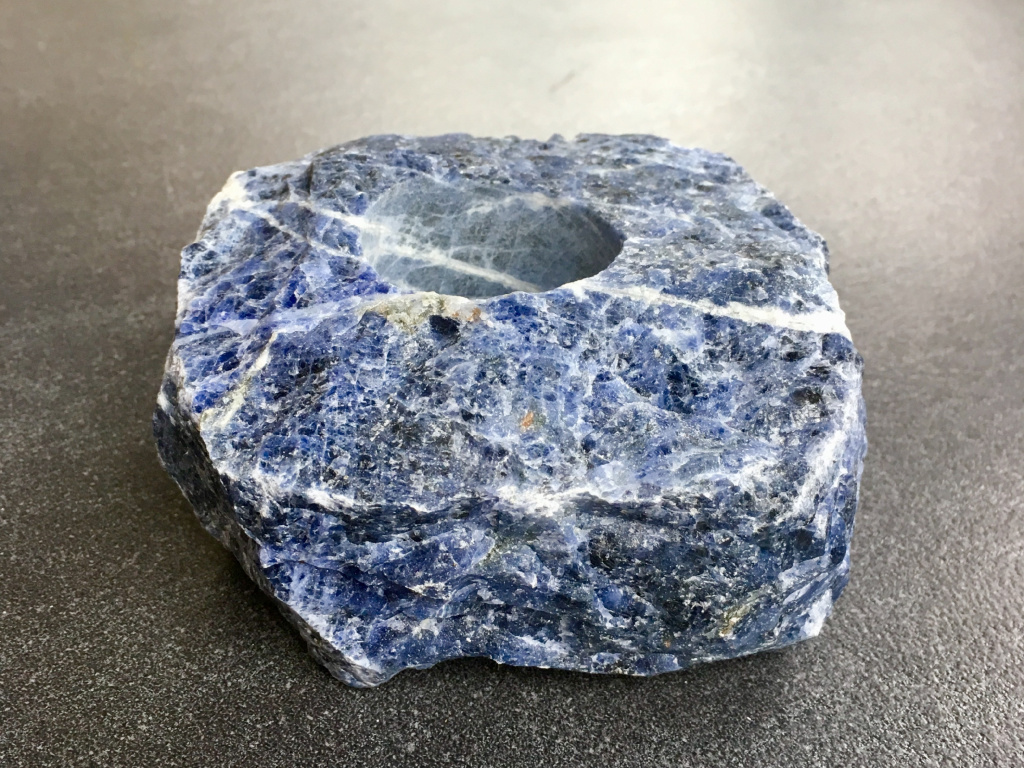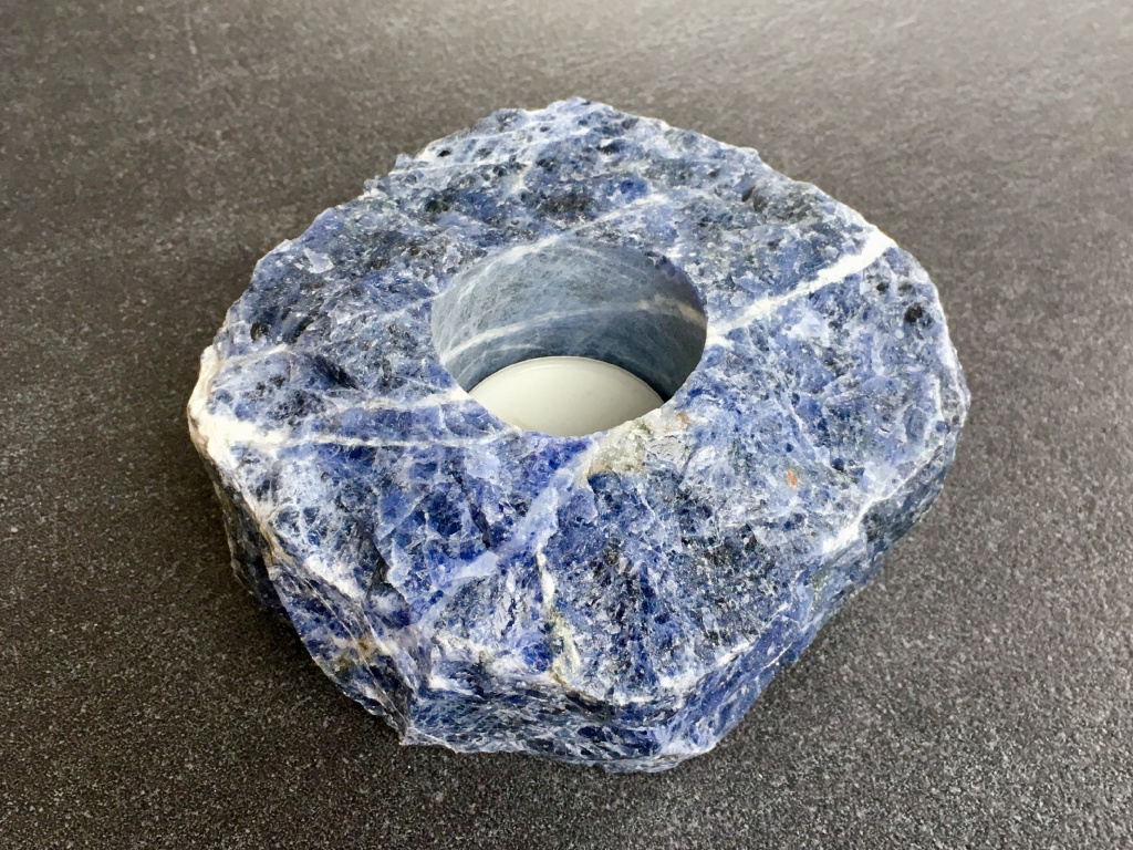 Sodalitový svícen v surové podobě spojuje sílu hluboké modři s klidným světlem svíčky. Výrazná kresba bílých žilek v modrém kameni z něj dělá nepřehlédnutelný doplněk, který zútulní každý interiér – od pracovny po meditační koutek.