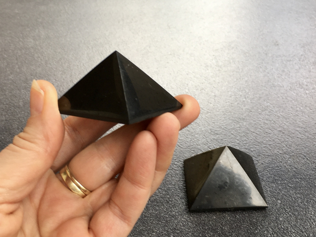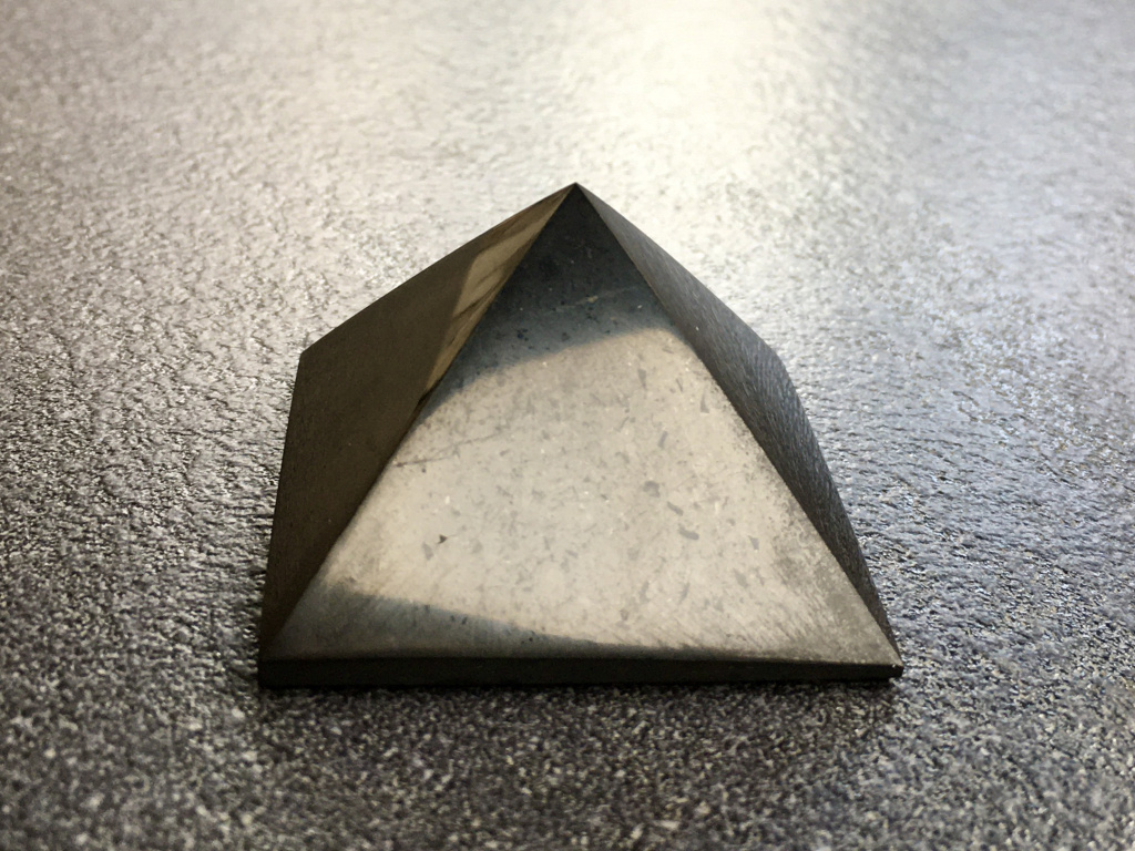Nádherná pyramida ze vzácného šungitu má schopnost nasávat škodliviny z okolního prostředí a zejména elektromagnetické záření.