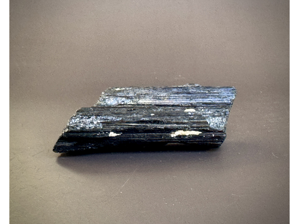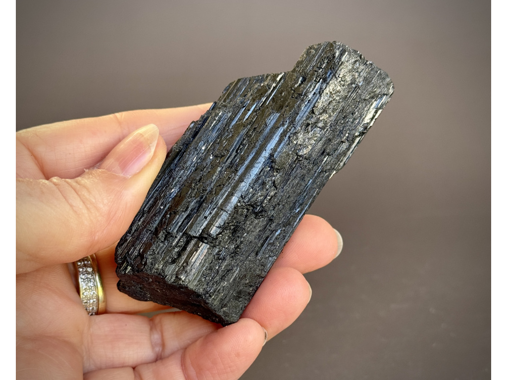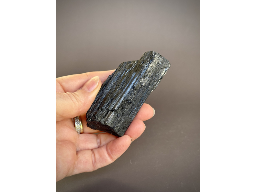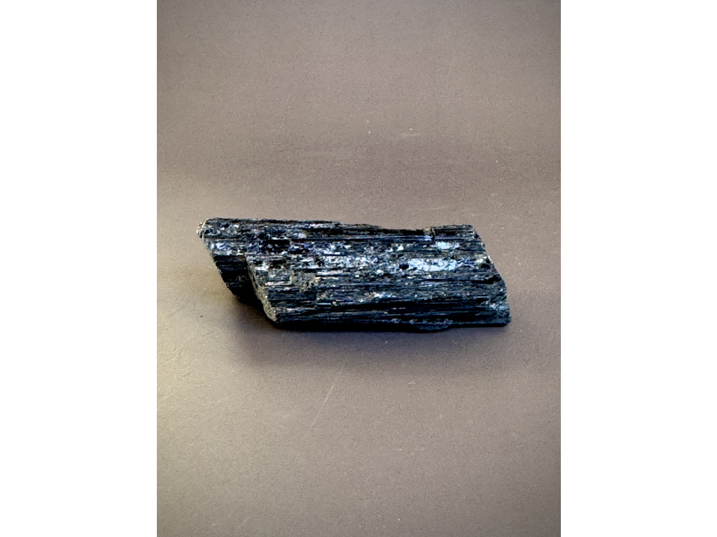 Dramatický kus přírodního černého turmalínu se svislou rýhovanou strukturou a matným až jemně lesklým povrchem. Autentický, neopracovaný tvar zdůrazňuje jeho surovou energii a dělá z něj výrazný prvek do pracovny, obýváku i meditačního koutku.