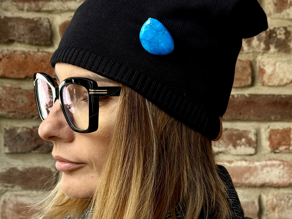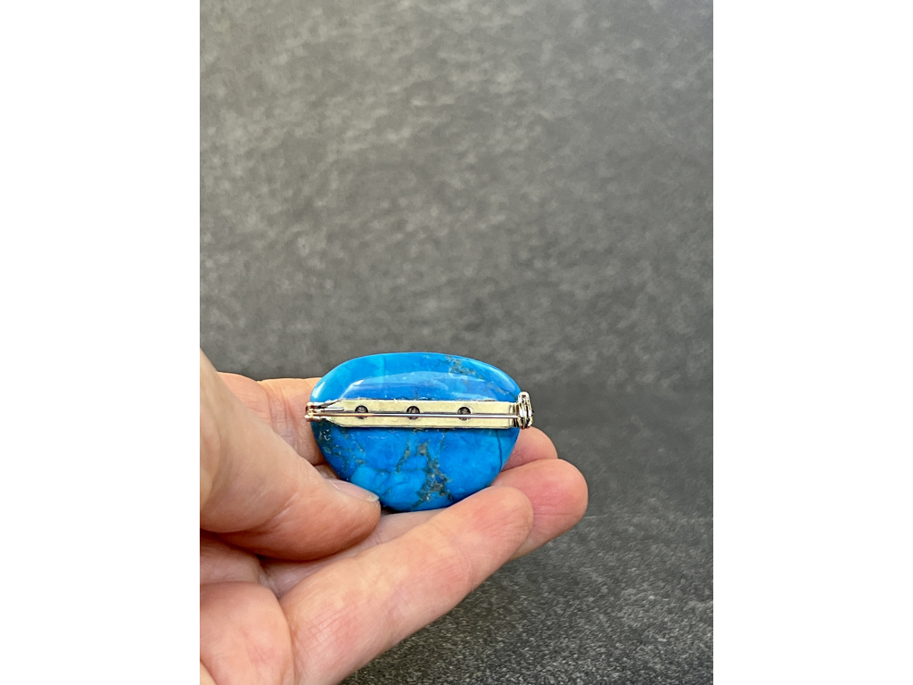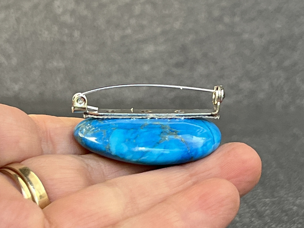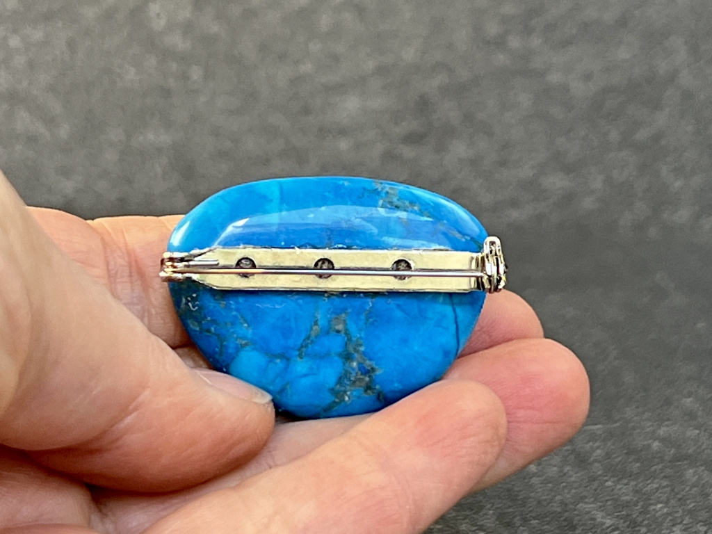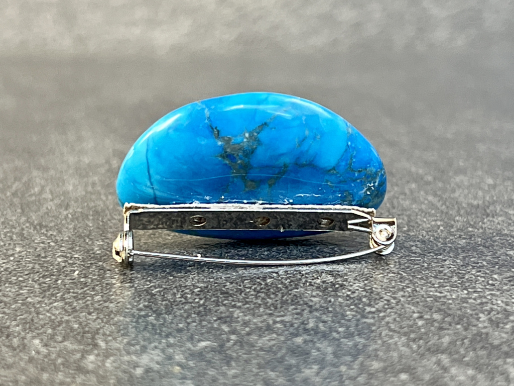 Brož z tyrkenitu ve tvaru placičky je ve své podstatě barvený modrý magnezit, který svým vzhledem připomíná tyrkys.