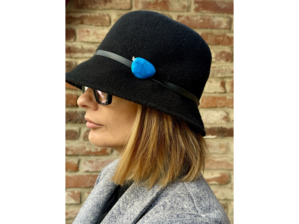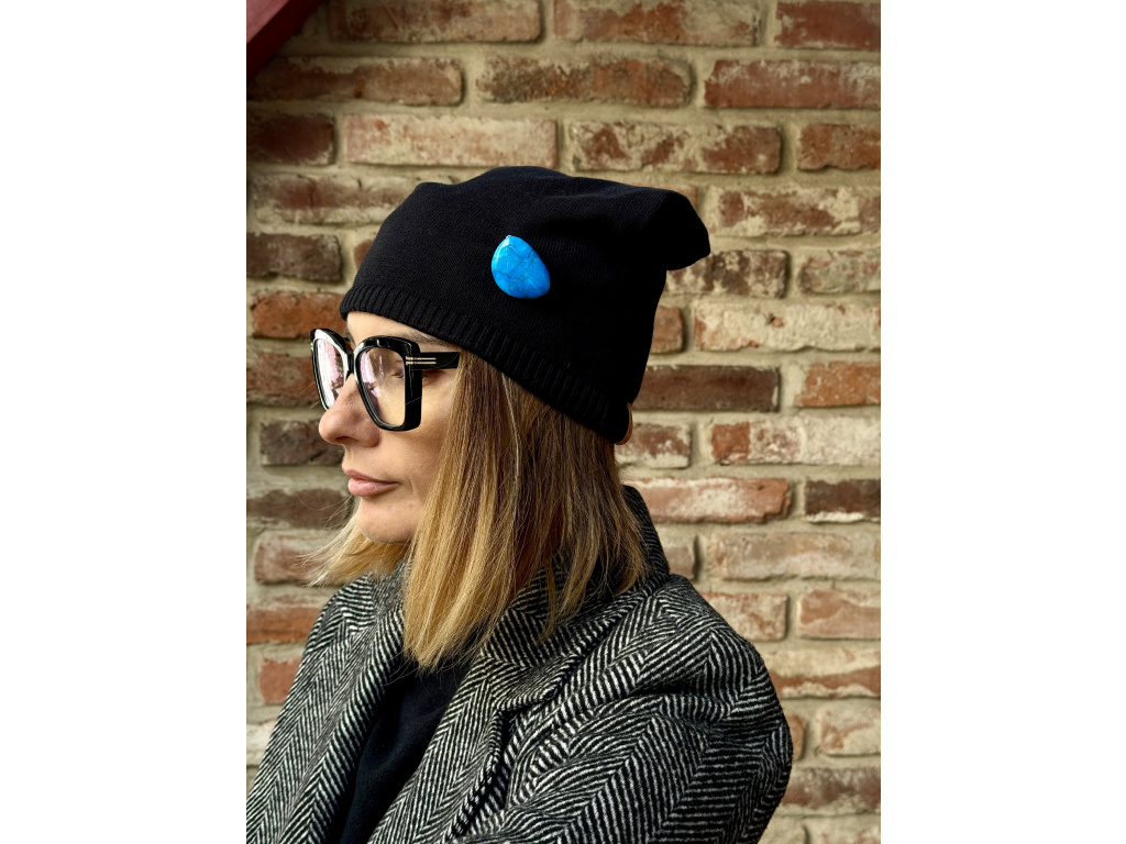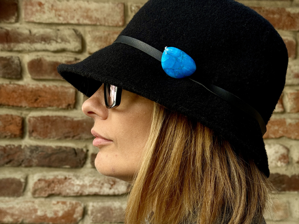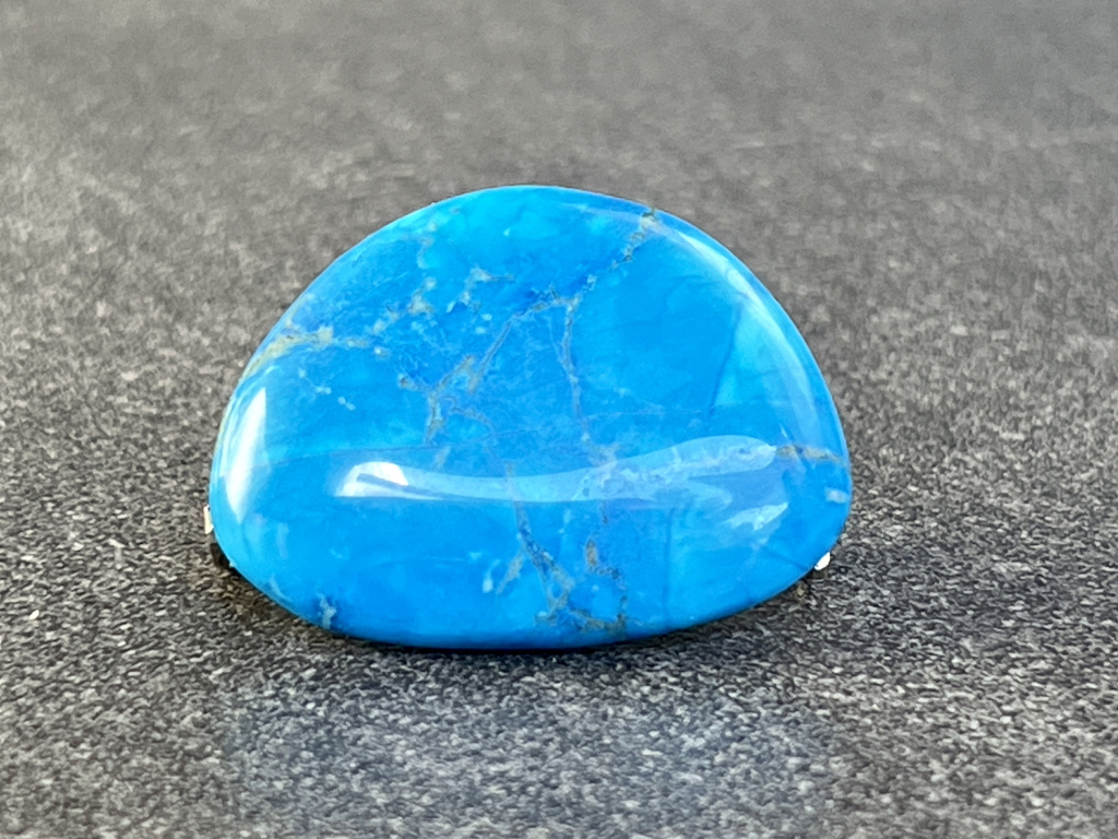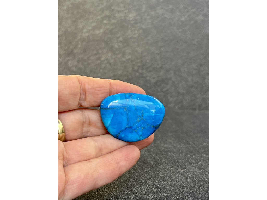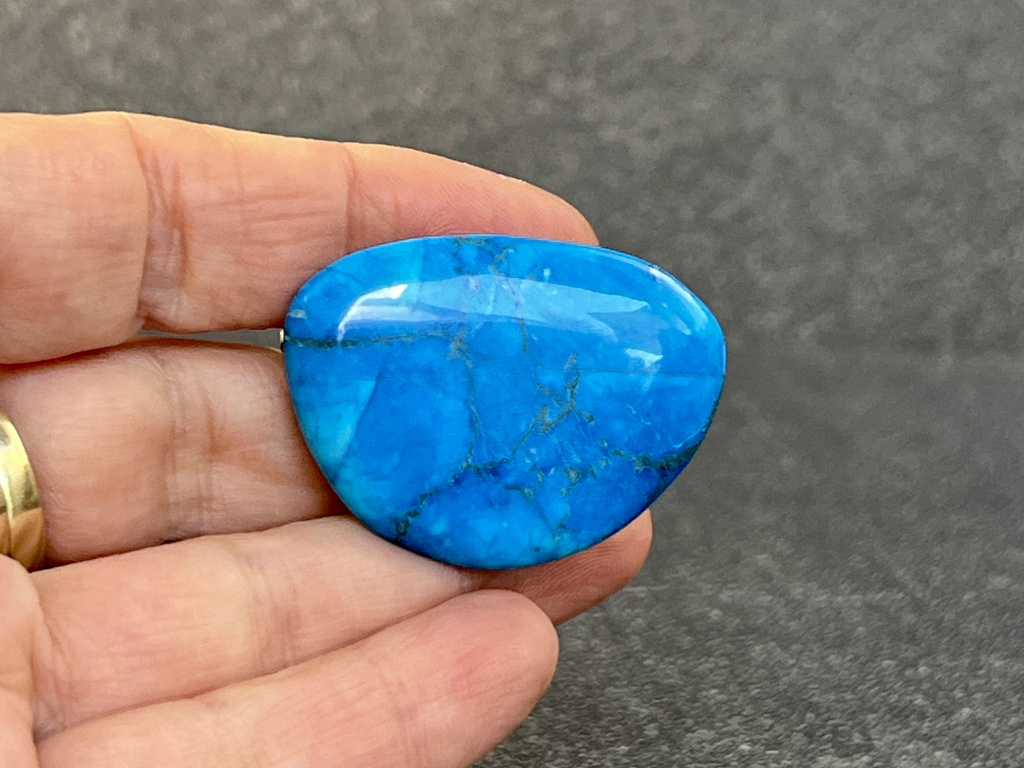 Brož z tyrkenitu ve tvaru placičky je ve své podstatě barvený modrý magnezit, který svým vzhledem připomíná tyrkys.